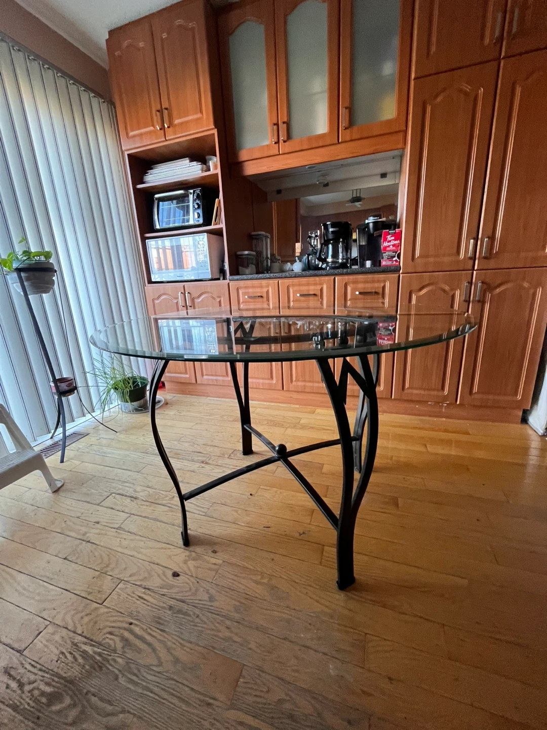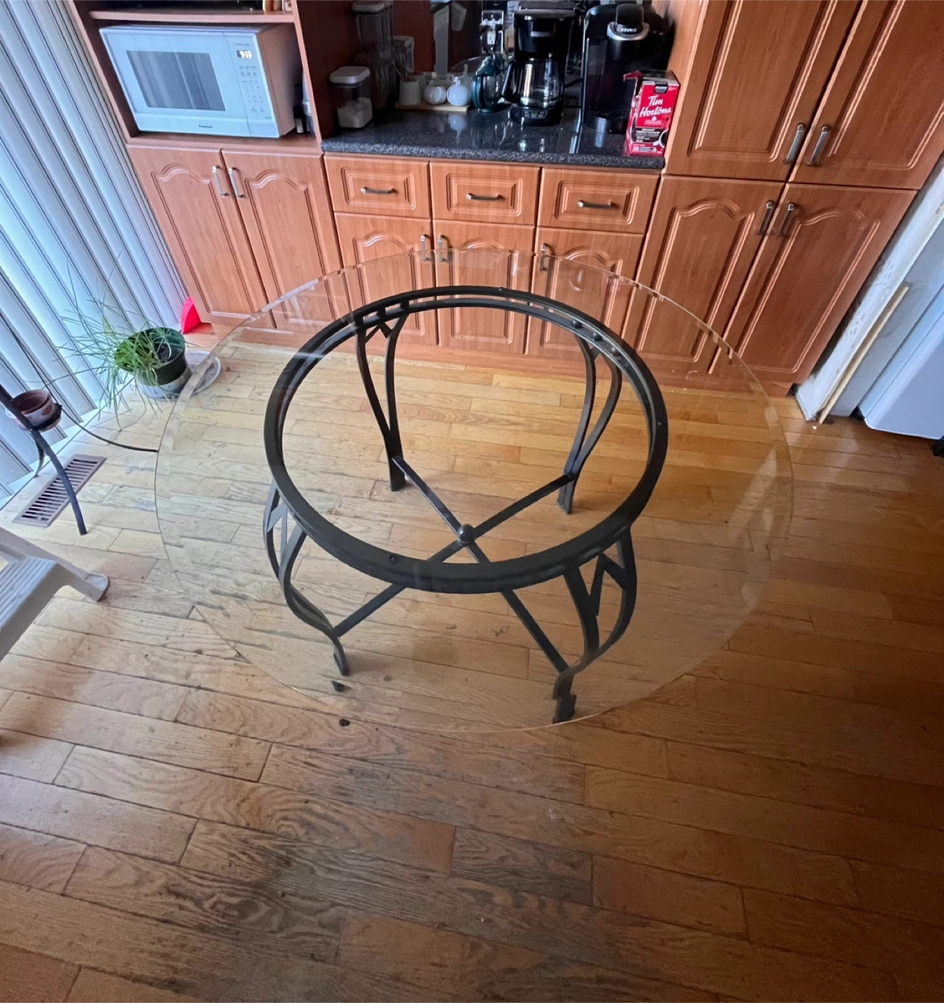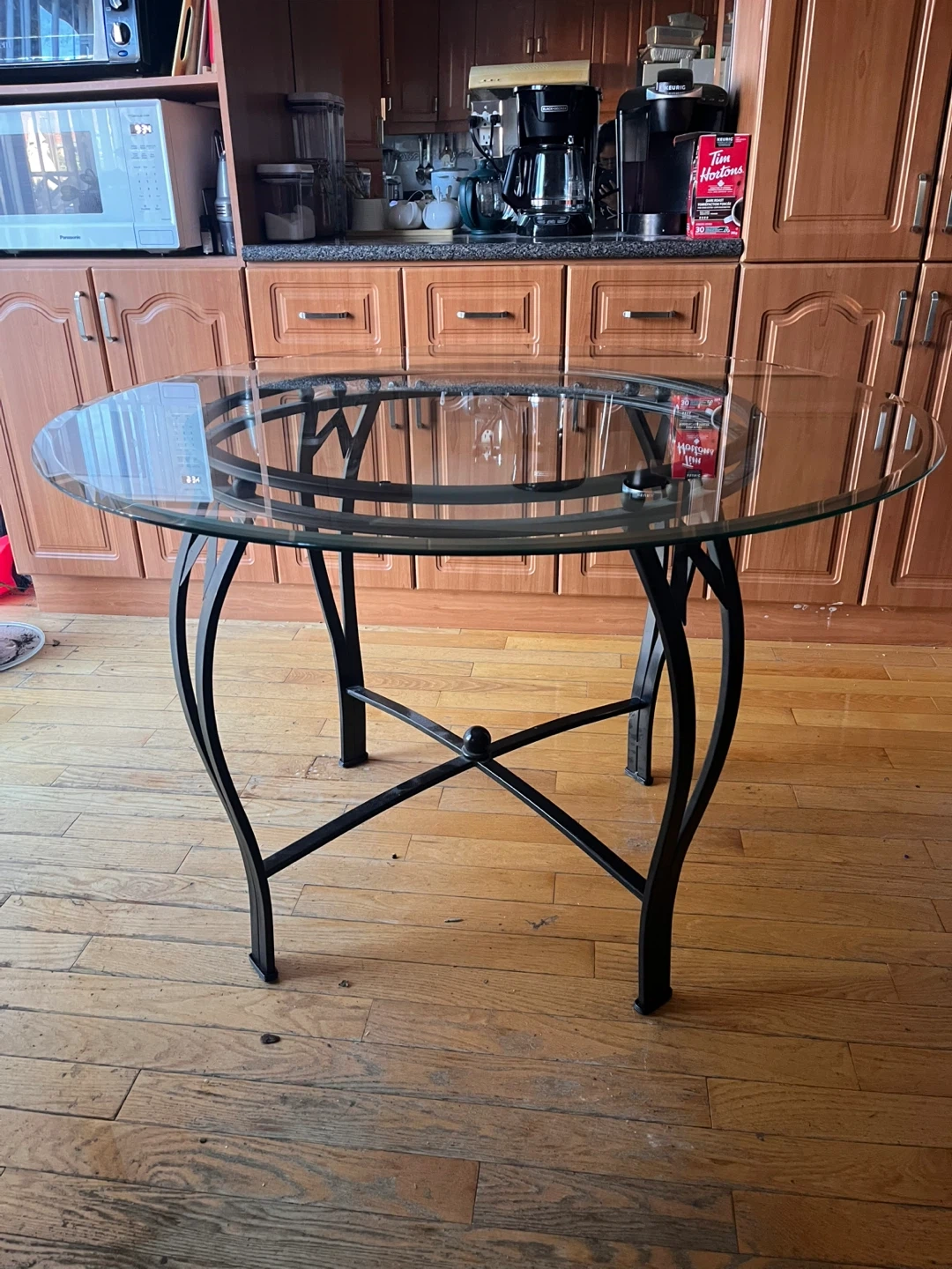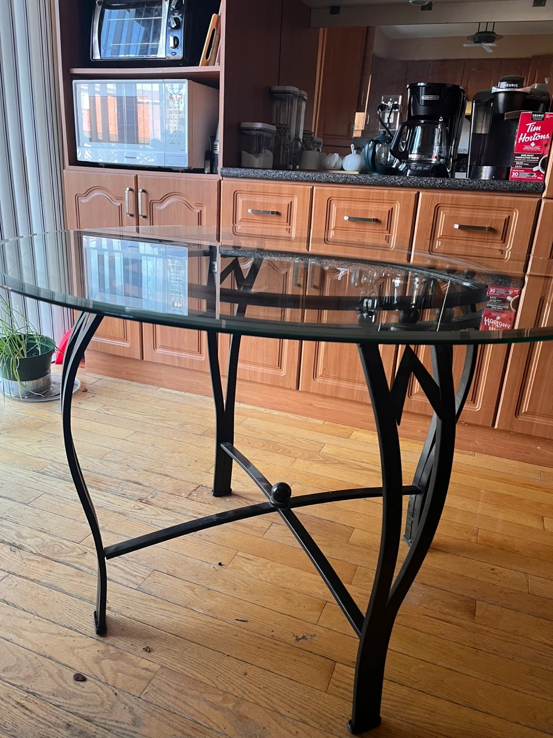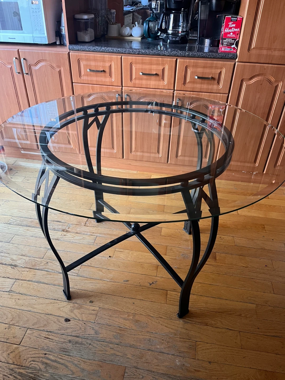 Selling a round dining table with a glass top and black metal legs. It's in good condition and would be great for a smaller dining space or kitchen nook! The glass top is easy to clean, and the black metal base gives it a modern look. The table can seat up to 4 comfortably.