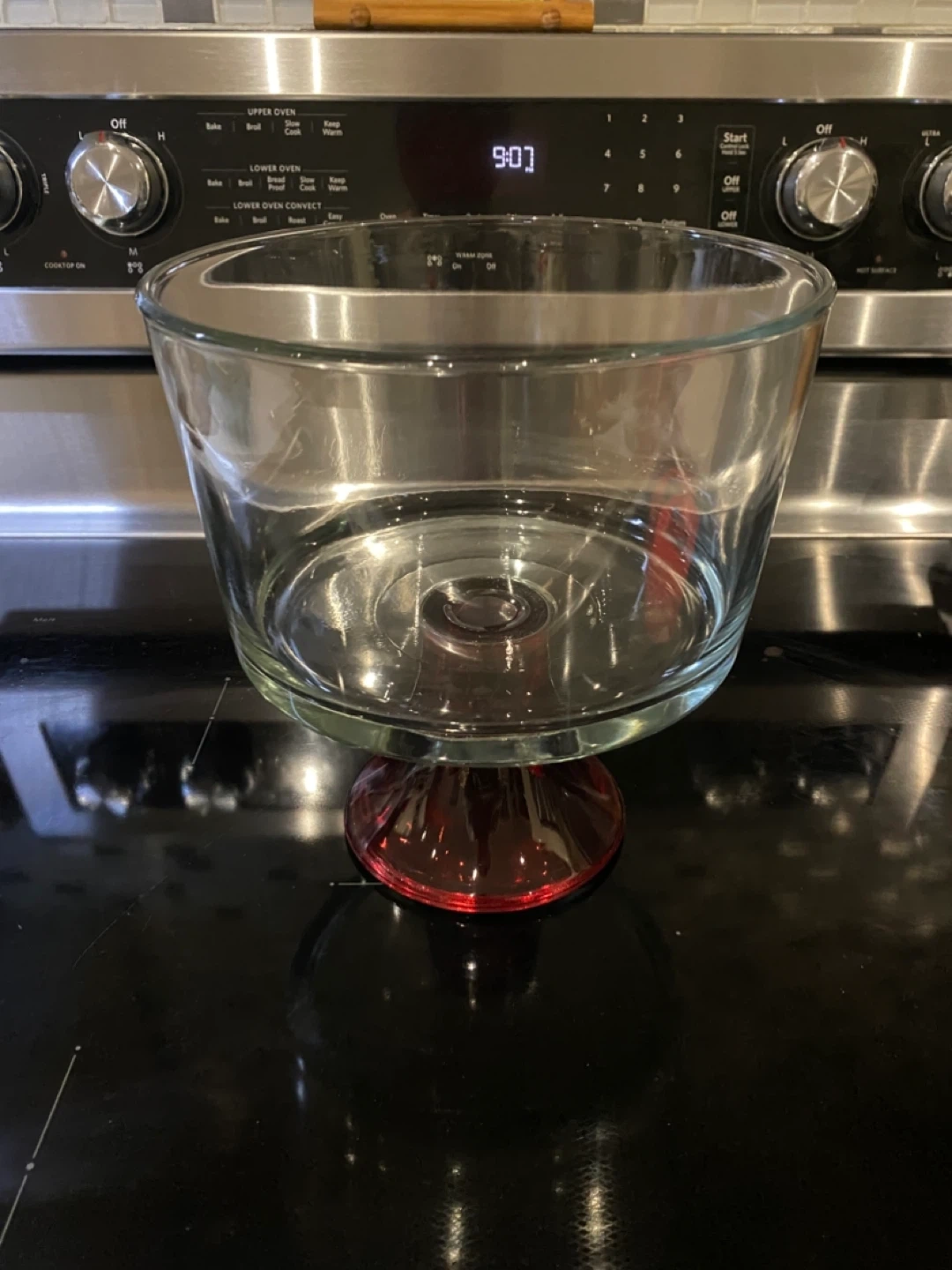 Selling a lovely glass trifle bowl with a red base. It's in great condition and perfect for desserts or displaying fruit. It would be a great addition to any kitchen or dining room! Measures 8-1/4” diameter. Pick up at Weston and Eglinton.