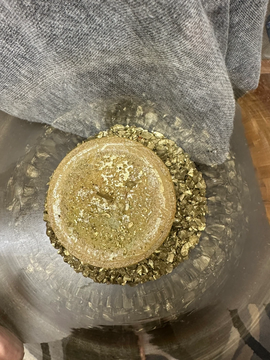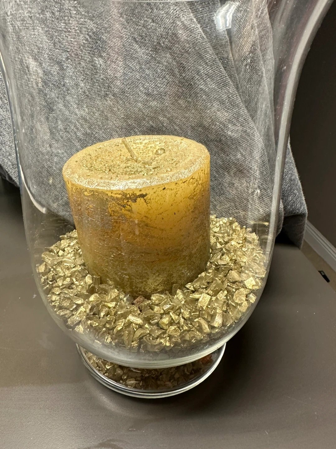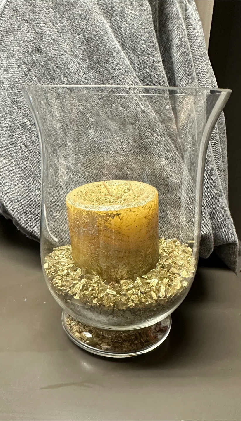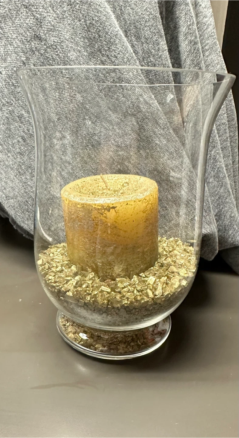 Selling a lovely glass vase with a candle inside. It also has some decorative gold rocks at the bottom. Great for adding a touch of elegance to any room!