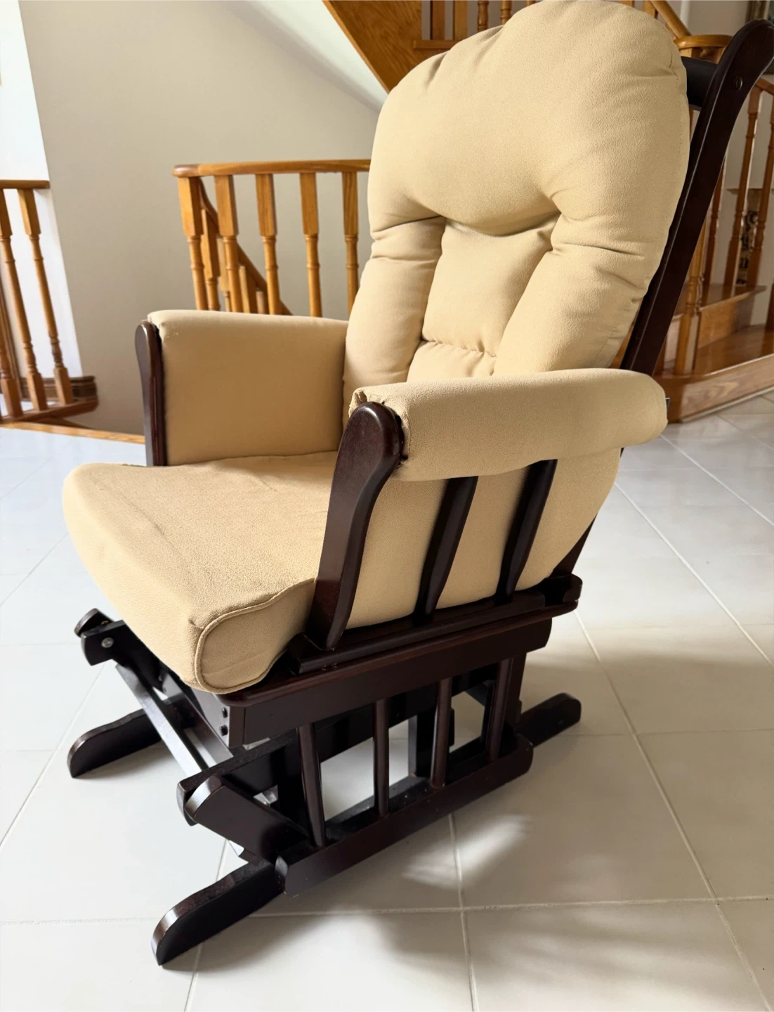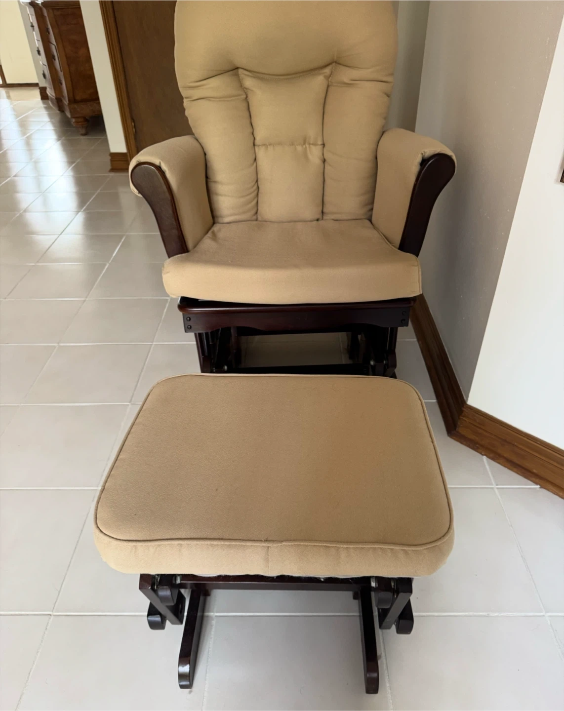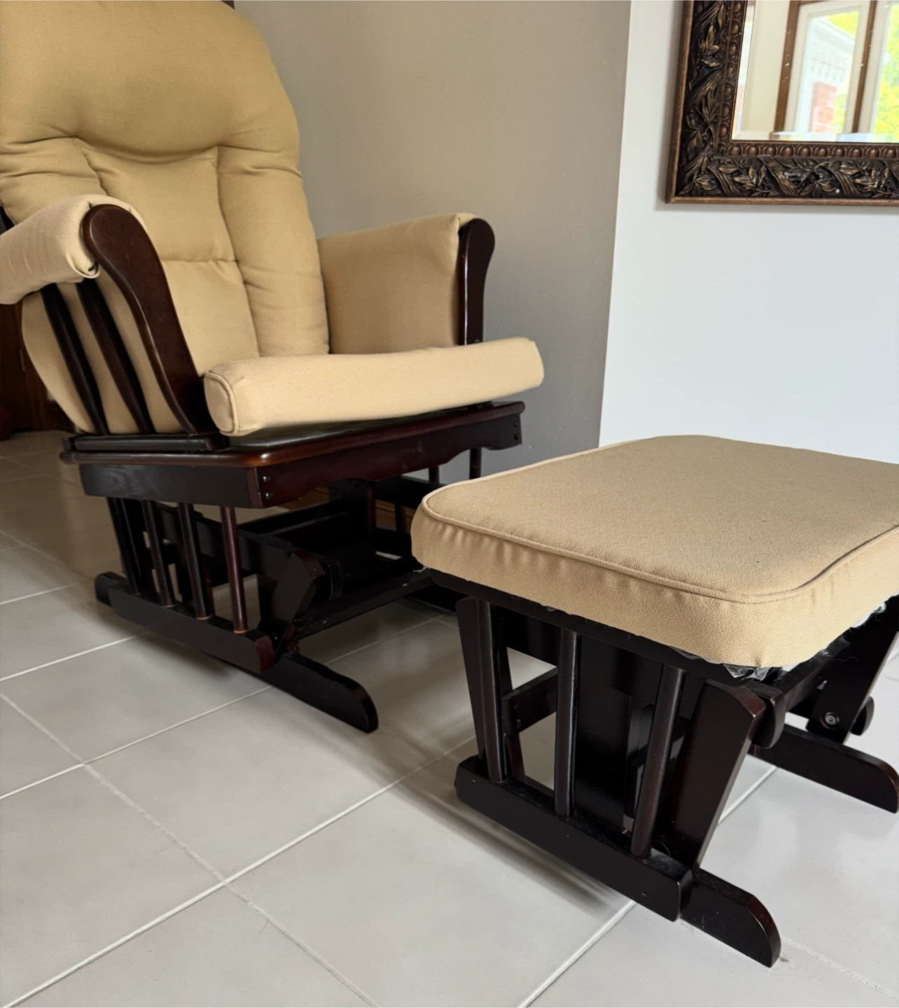 Cozy glider rocker and ottoman set! Perfect for relaxing alone or with a little one or just unwinding after a long day. The cushions are a soft beige colour and the wood is a dark brown. Comfortable and in great condition!
