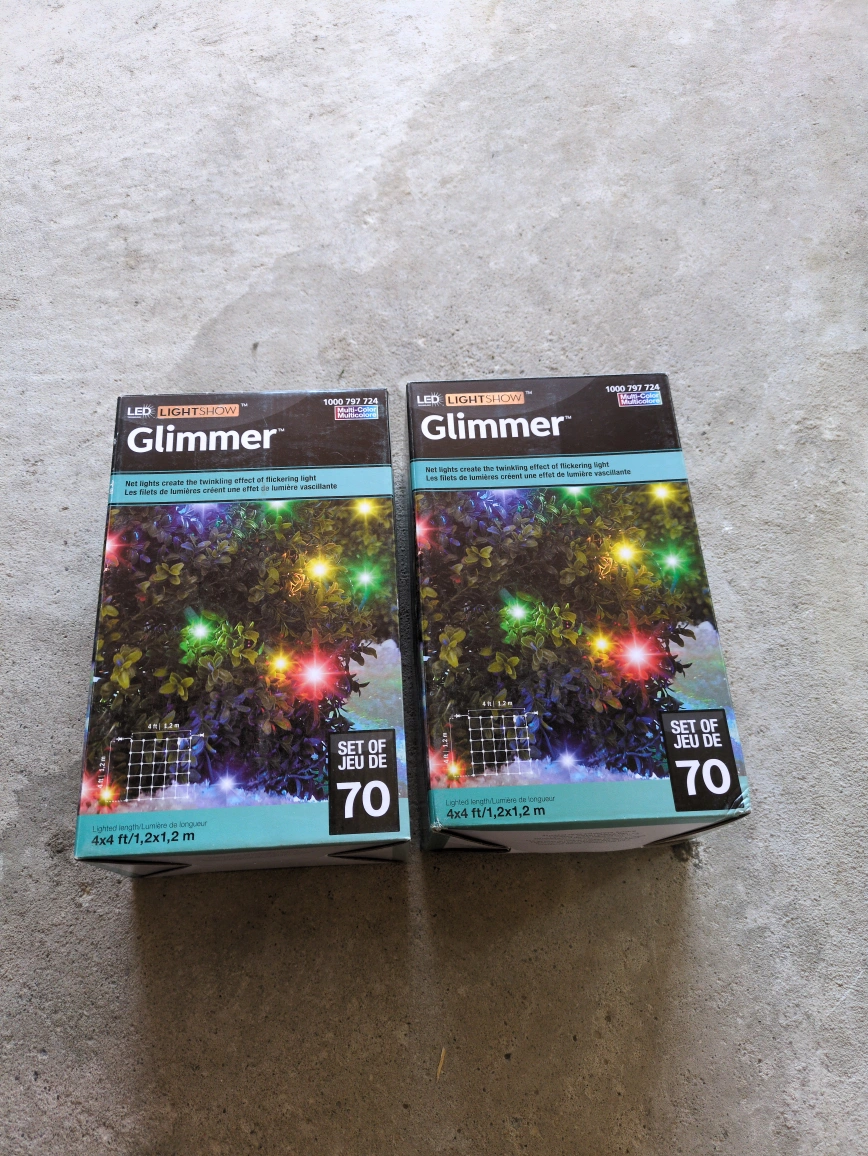 Selling a set of Glimmer LED Lightshow net lights. These multi-color lights create a lovely twinkling effect, perfect for adding a festive touch to your garden or outdoor space! The lighted length is 4x4 ft (1.2x1.2 m), and there are 70 lights in each set 4 boxes are still available. $40 for 4 boxes
