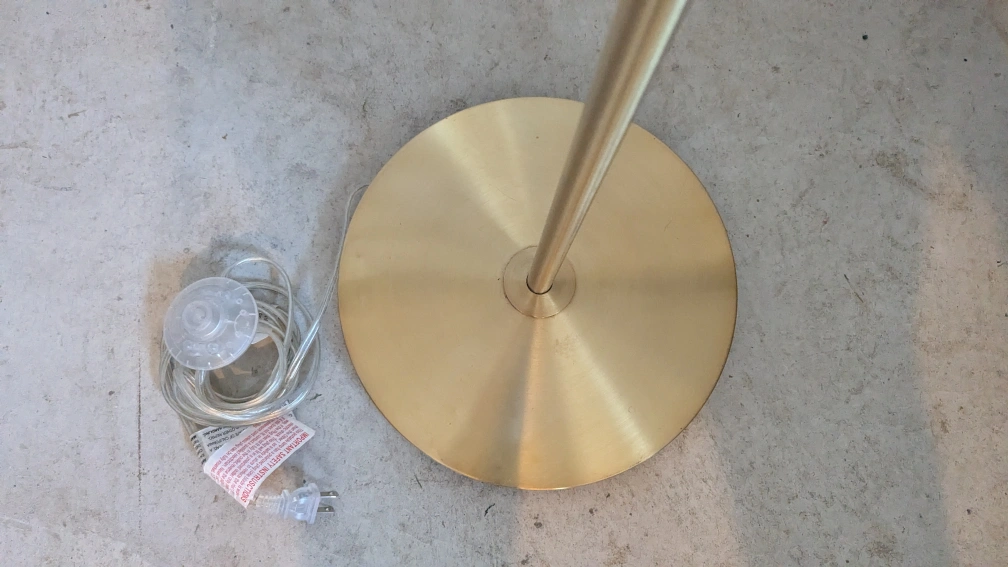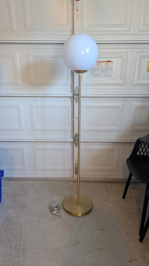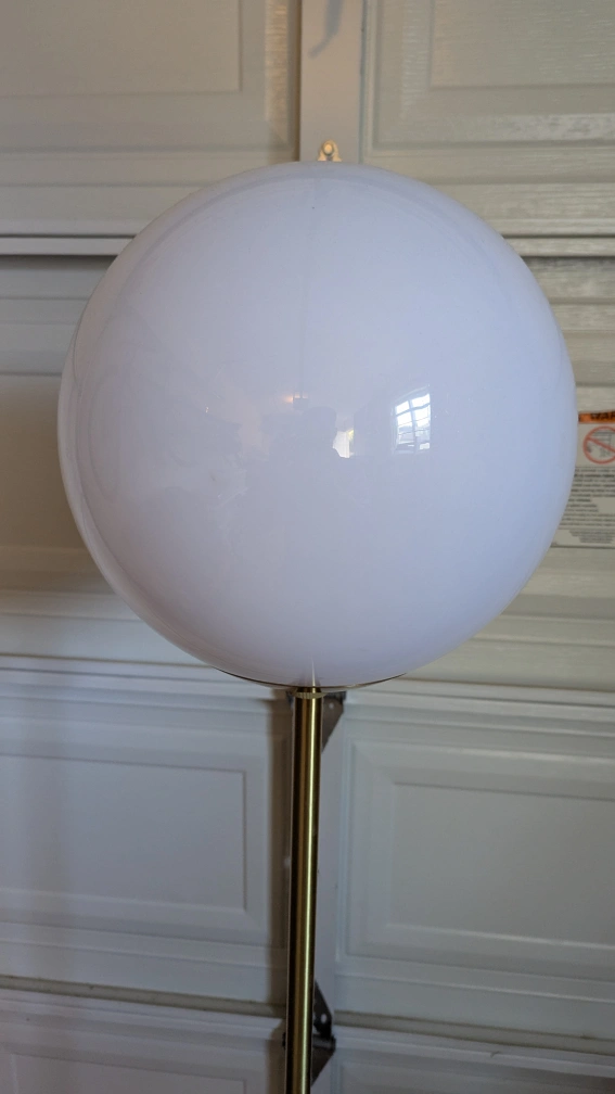 Selling a stylish globe floor lamp with a brass finish! It adds a touch of modern elegance to any room. The lamp features a spherical white shade and a sleek, slender brass stand. It's in great condition and ready to brighten up your space