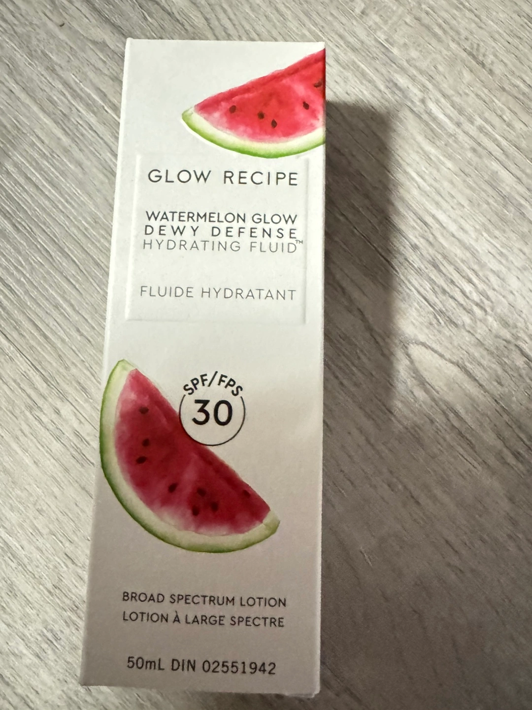 Selling a Glow Recipe Watermelon Glow Dewy Defense Hydrating Fluid! It's a broad spectrum lotion in a 50mL size. Perfect for daily hydration and defense against the elements