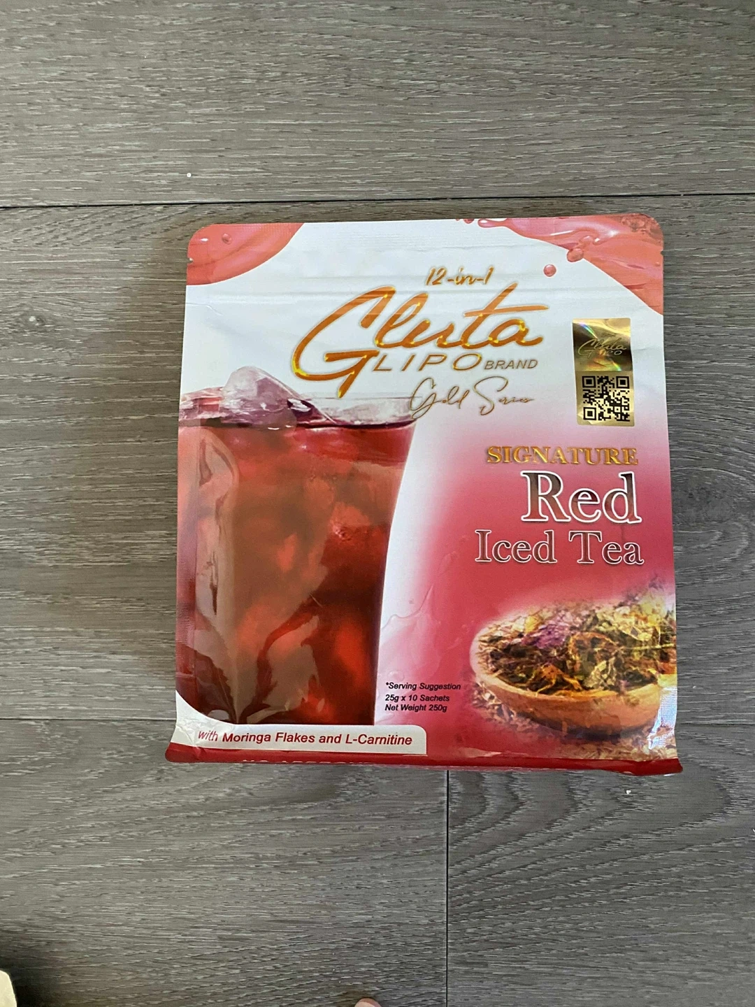 Selling a Gluta Lipo Brand Signature Red Iced Tea, 12-in-1 with Moringa Flakes and L-Carnitine. Each package contains 25g x 10 sachets, with a net weight of 250g. Perfect for a refreshing and healthy drink!