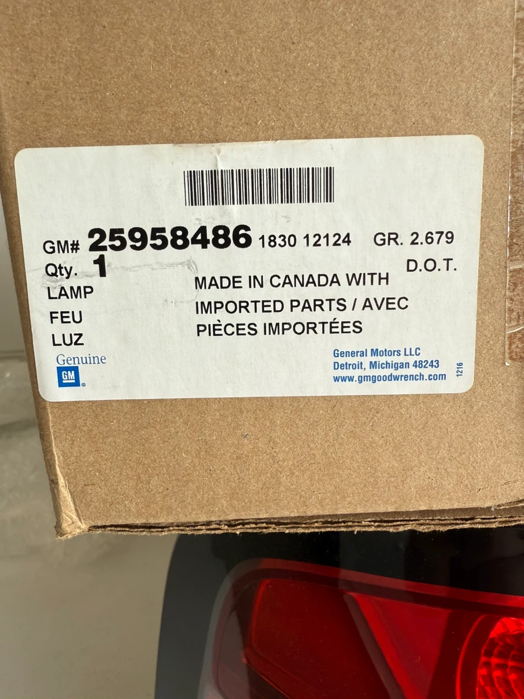 Selling a GM tail light lamp, part number 25958486. It's made in Canada with imported parts. Comes in the original box! tail light lens assembly specifically designed for the left-hand side of 2014-2018 GM vehicles. This is a used part but is in good working condition. Here are the details: * **Compatibility:** Fits 2014-2018 GM models * **Position:** Left-hand (LH) side * **Condition:** Used