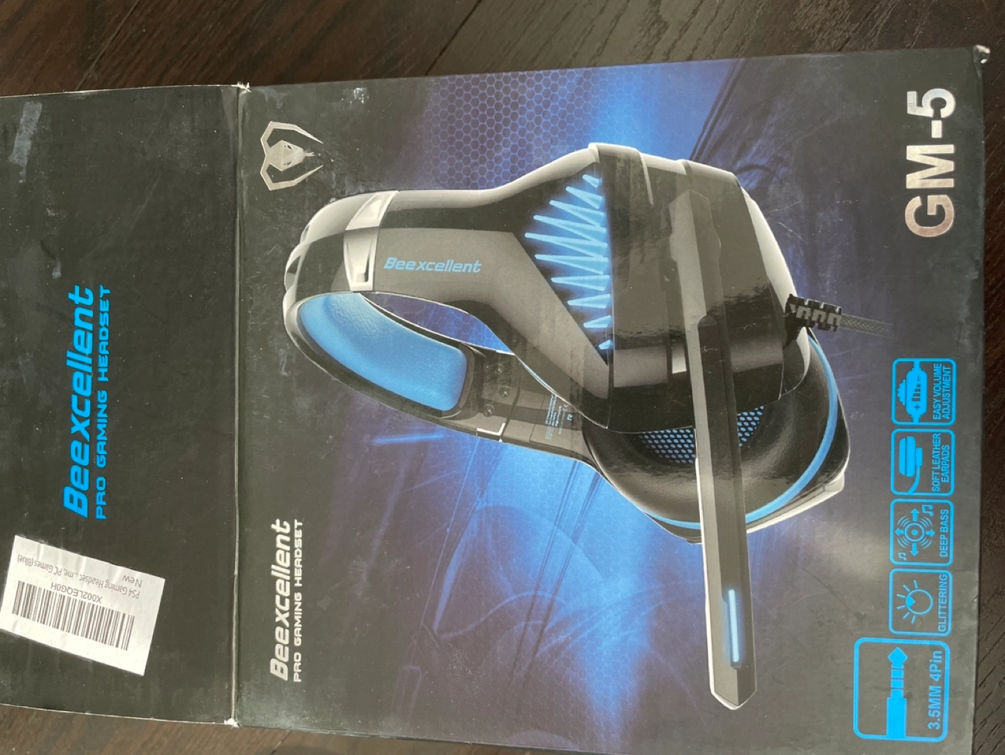 Wired gaming headset. Blue and black accents. LED lighting. Over-ear design. Includes microphone. New in box.