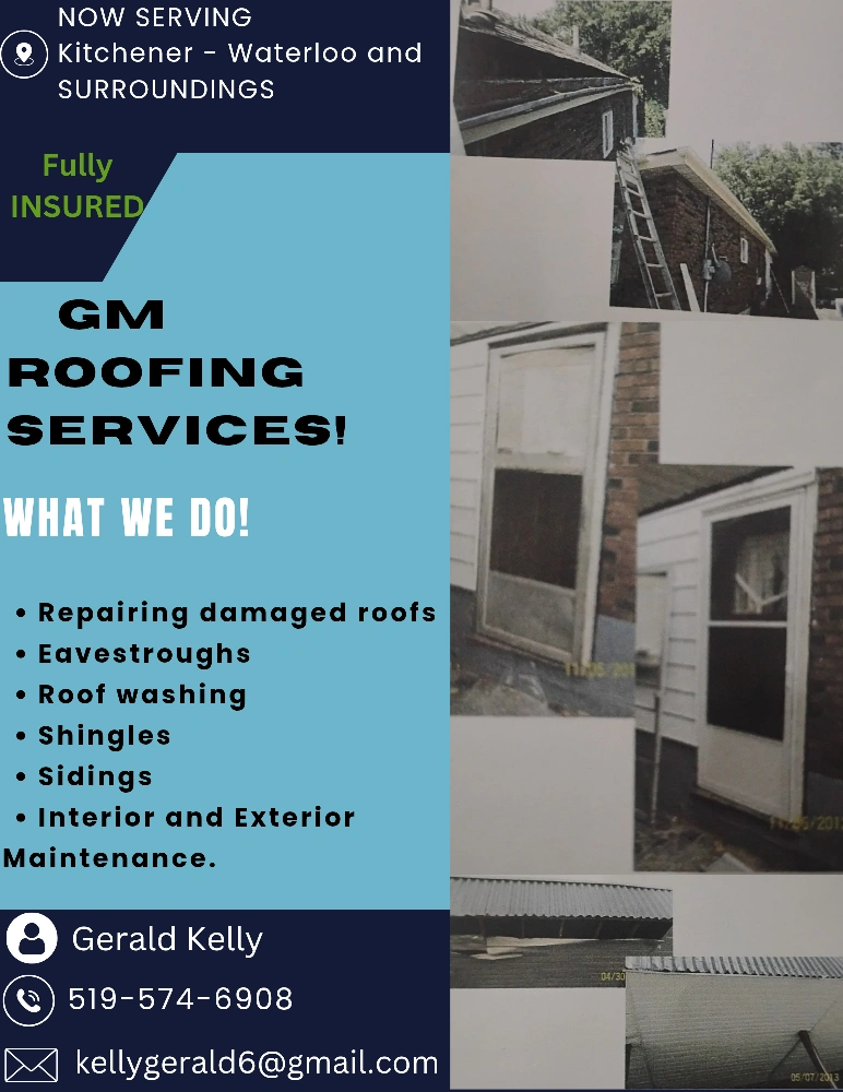 ( PLEASE CONTACT FOR PRICING) Providing top-notch roofing services in the Kitchener-Waterloo area! I'm Gerald Kelly, and at GM Roofing Services, I specialize in repairing damaged roofs, eavestrough maintenance, roof washing, shingle installation, siding work, and comprehensive interior and exterior maintenance. Fully insured for your peace of mind. What I Do: - Repairing damaged roofs - Eavestroughs - Roof washing - Shingles - Sidings - Interior and Exterior Maintenance If you're seeing this ad, it means I'm ready to bring my tools and expertise to your roofing needs! Give me a shout—I'm as available as sunshine on a clear day! Contact Gerald Kelly 519-574-6908