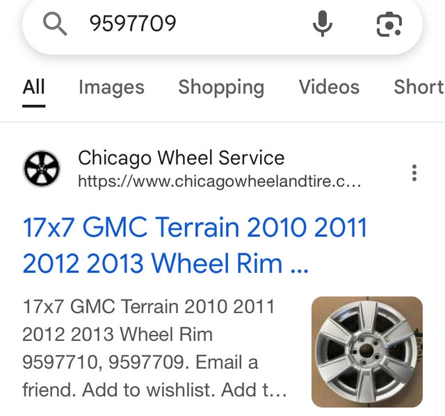 17” rims from GMC Terrain Part number 9597709 Ideal for winter or summer tires Condition: Used Make: GMC Model: Terrain Year: 2013 For Sale By: Owner Body Type: SUV, Crossover