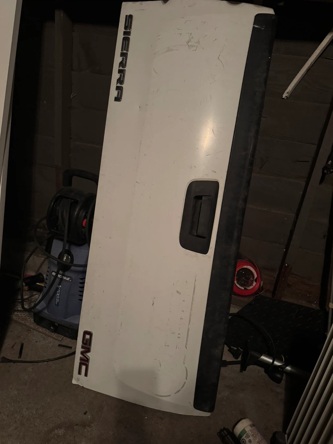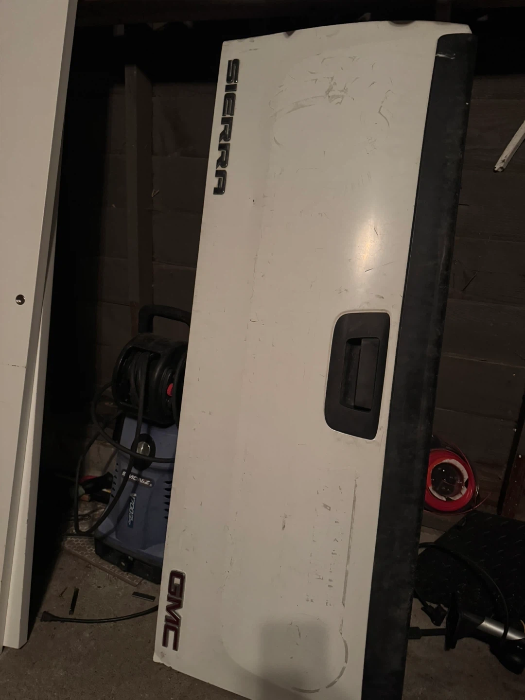 Selling a tailgate from a GMC Sierra. It's white and has the 'SIERRA' logo on it. There are some scratches, but it's still functional. Great for replacing a damaged tailgate! And from a 2011 gmc