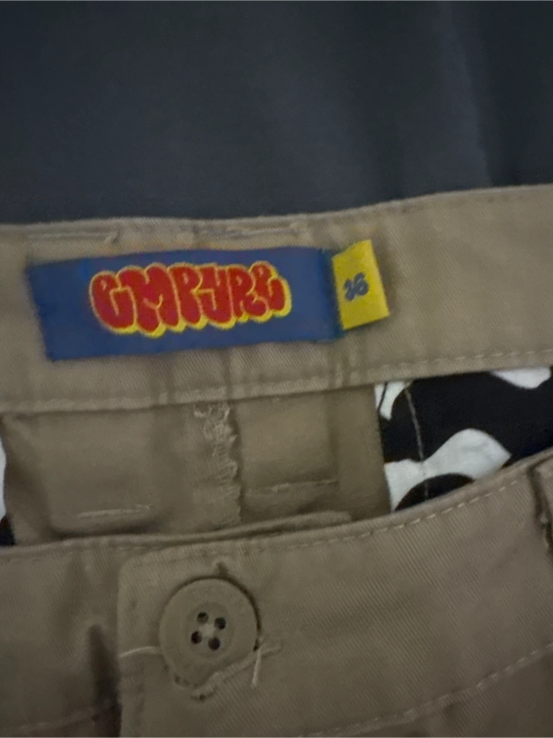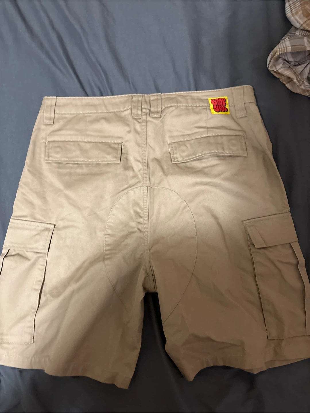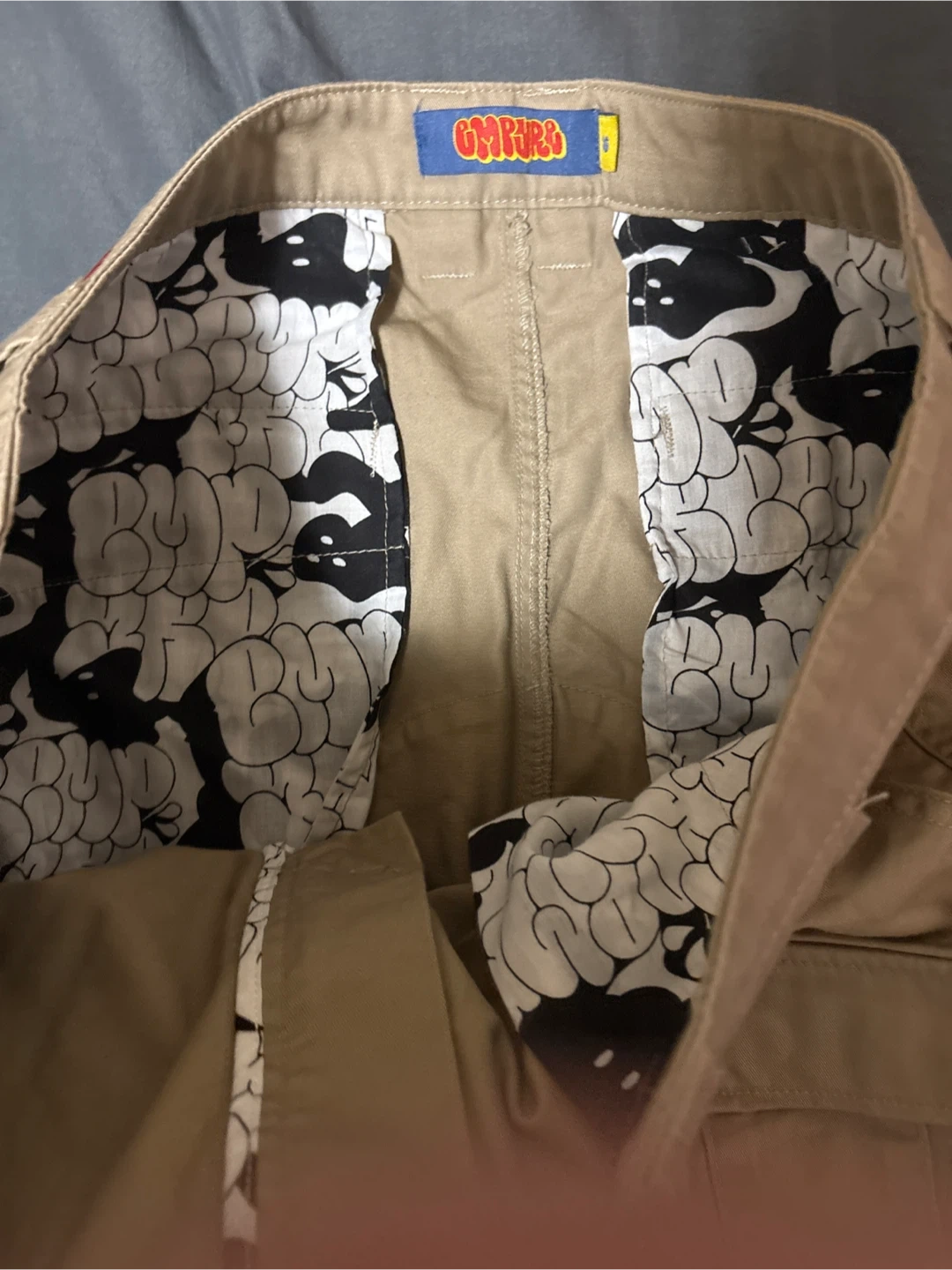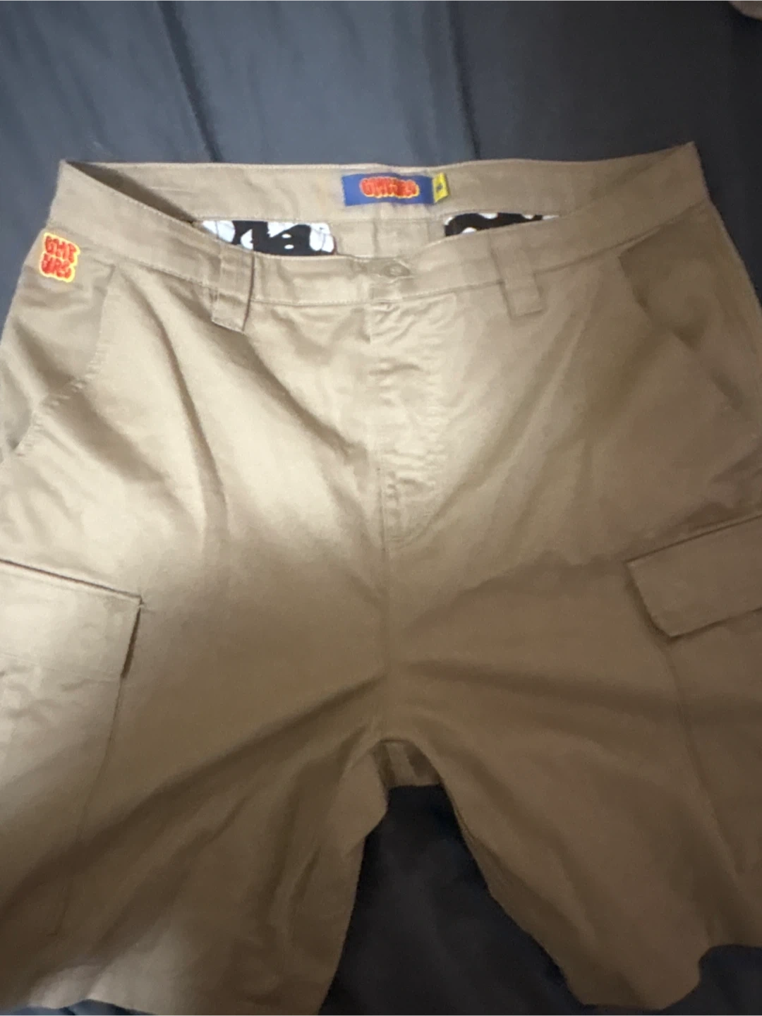 Selling a pair of GMP JRC cargo shorts. They are a size 36 and in great condition. The shorts are a tan colour with a unique black and white pattern on the inside lining. Perfect for everyday wear!