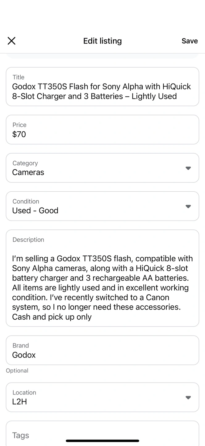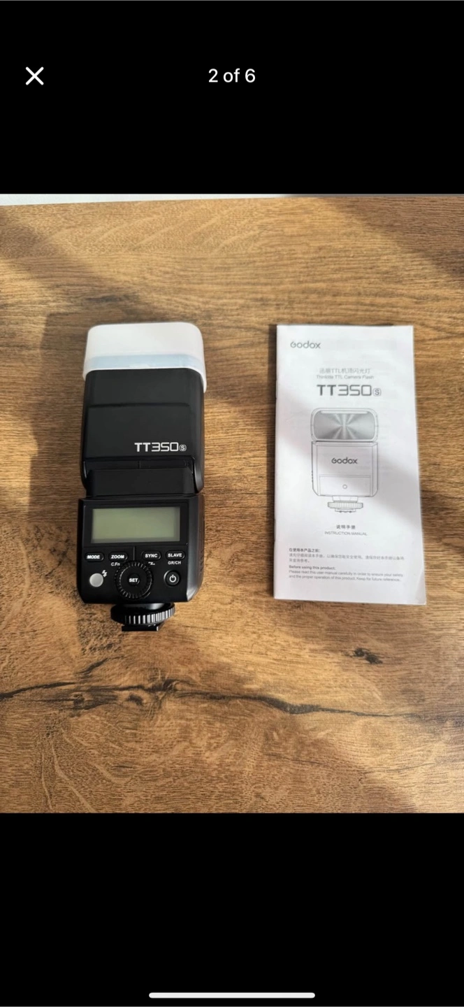 Selling a Godox TT350S flash, compatible with Sony Alpha cameras. Also included is a HiQuick 8-slot battery charger and 3 rechargeable AA batteries. All items are lightly used and in excellent working condition. Comes with the original pouch and manual