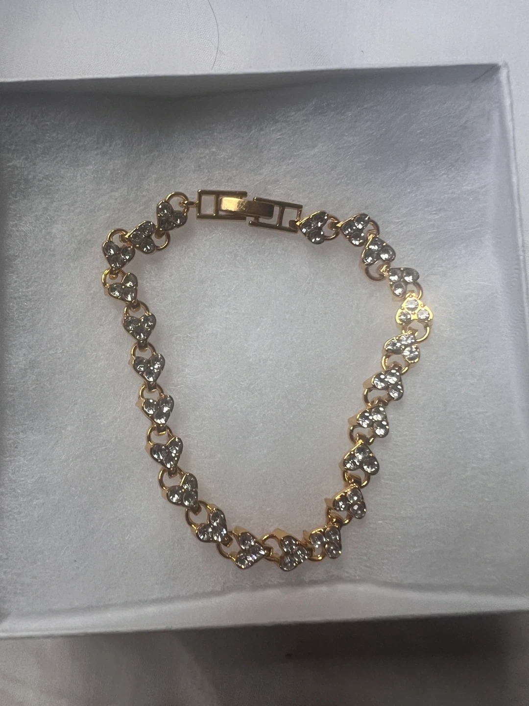 This is a lovely gold-tone bracelet featuring heart-shaped links, each adorned with sparkling clear stones. It's in great condition. Came in a Swarovski box but not 100% sure if it is swarovski. too big for me so iโm selling it ๐