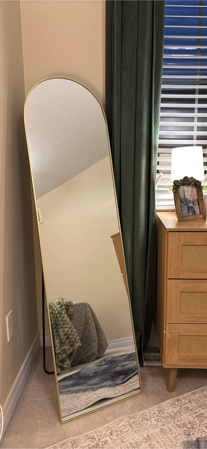 Selling a full-length arched mirror with a gold frame. It's in great condition and would look lovely in any room! The mirror is perfect for checking out your outfit before heading out or just adding a touch of elegance to your space