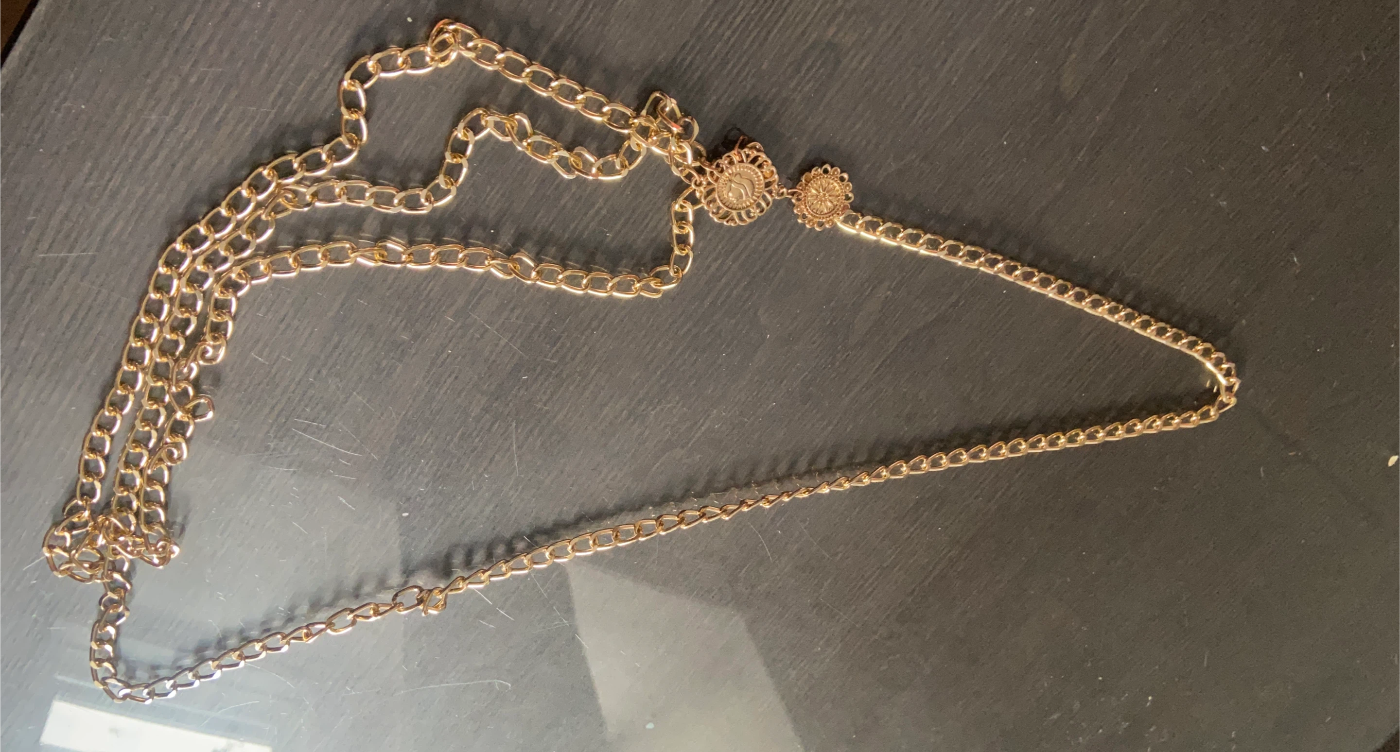 Selling a gold chain belt. It's in great condition and has a unique design with decorative medallions. Perfect for adding a touch of glamour to any outfit!