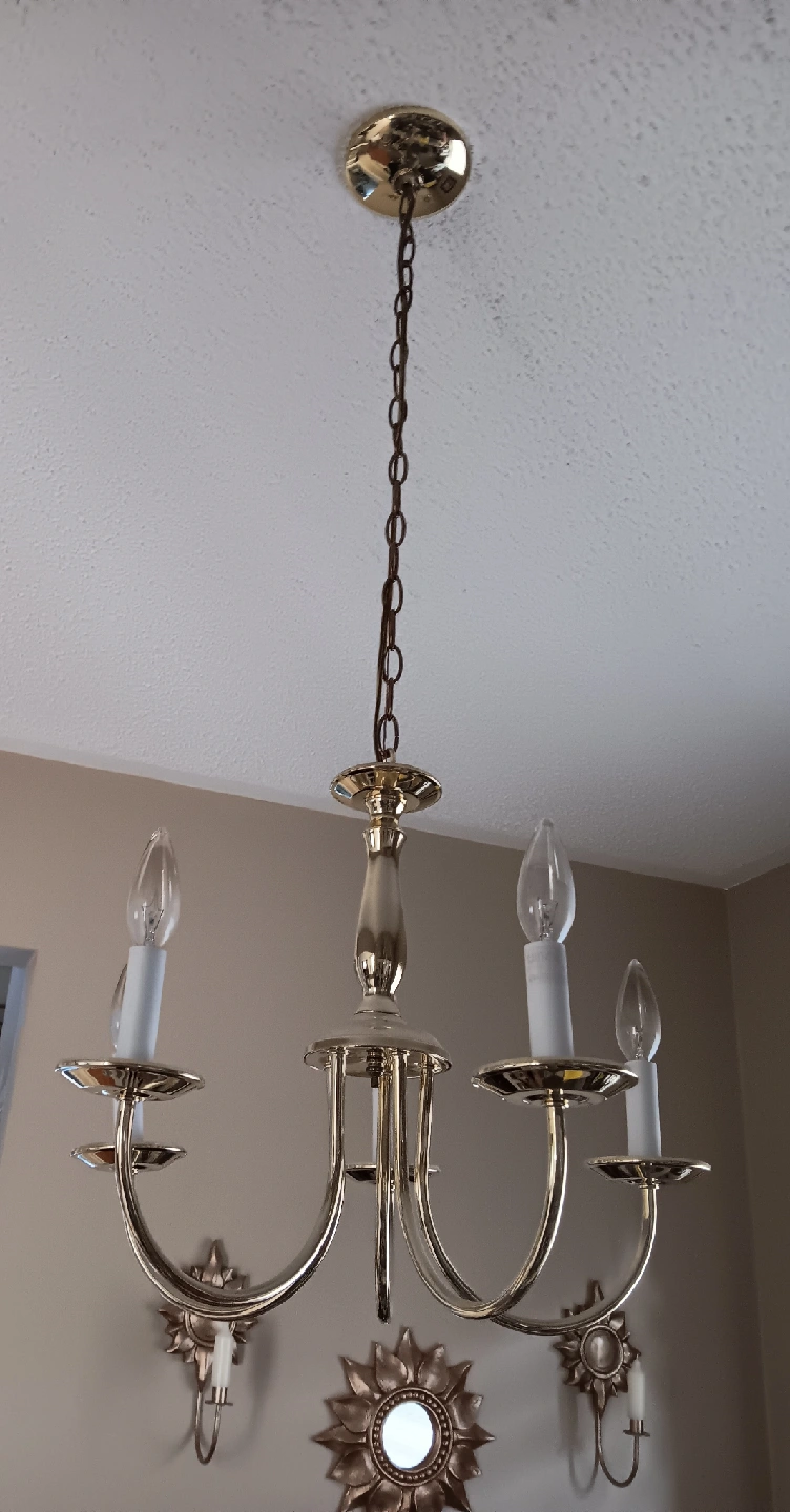 Elegant gold-tone chandelier with five lights. It's in great shape and would add a touch of class to any room!