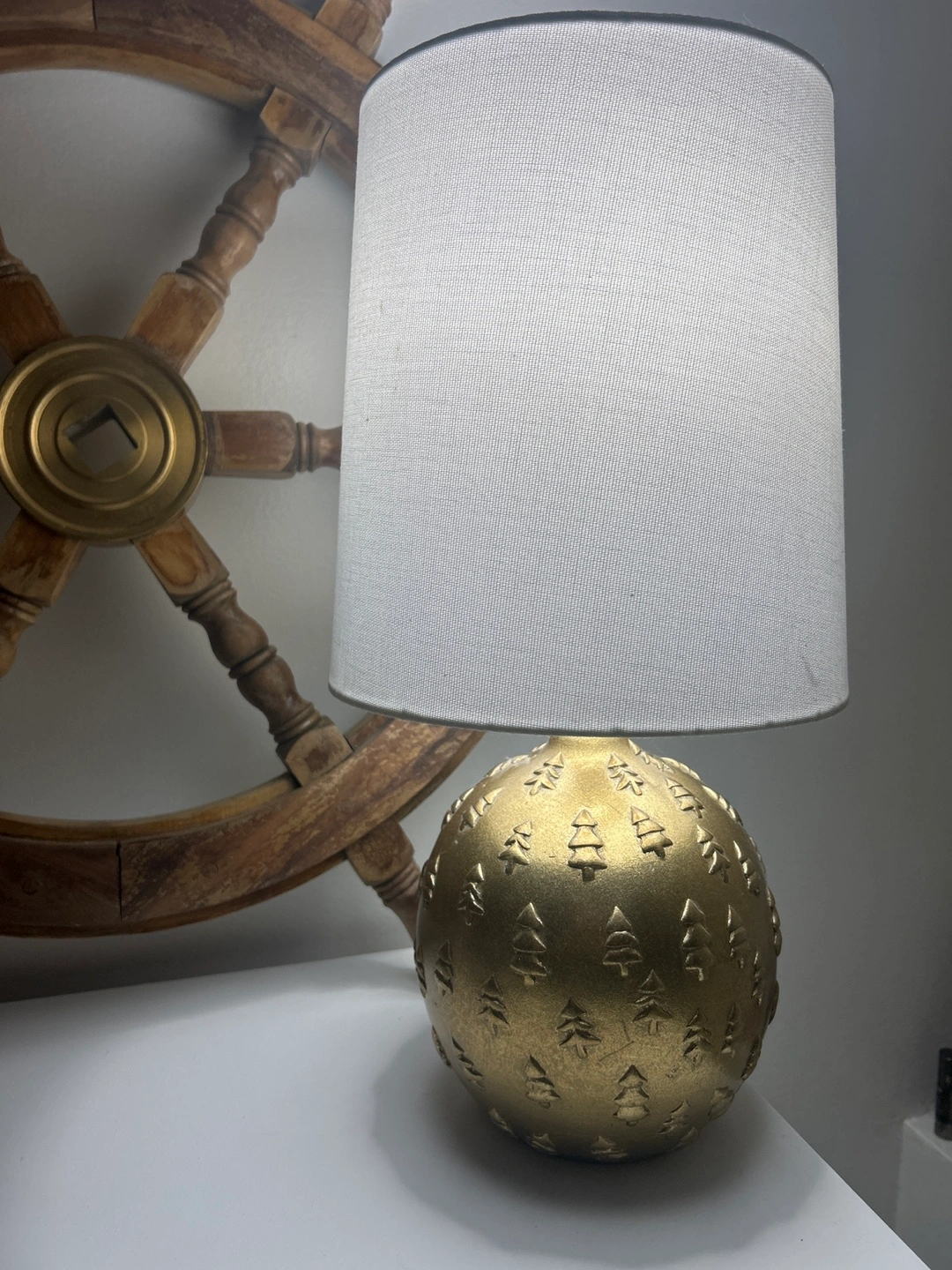 This is a cute table lamp with a gold base featuring a Christmas tree pattern and a white lampshade. It would be perfect for adding a touch of festive cheer to any room!