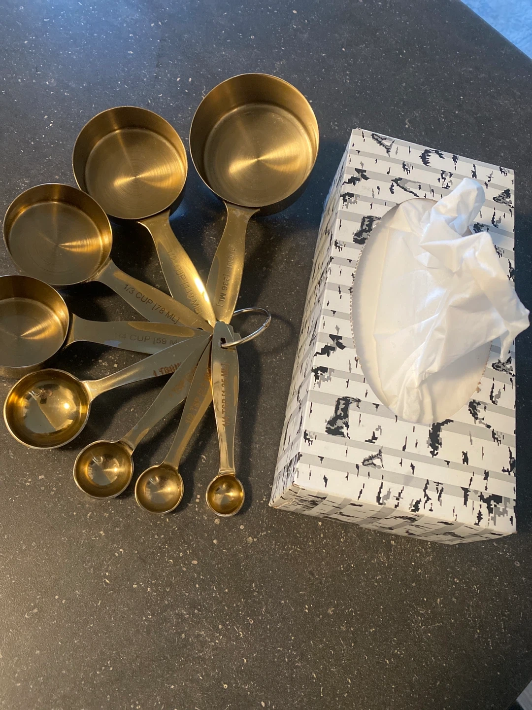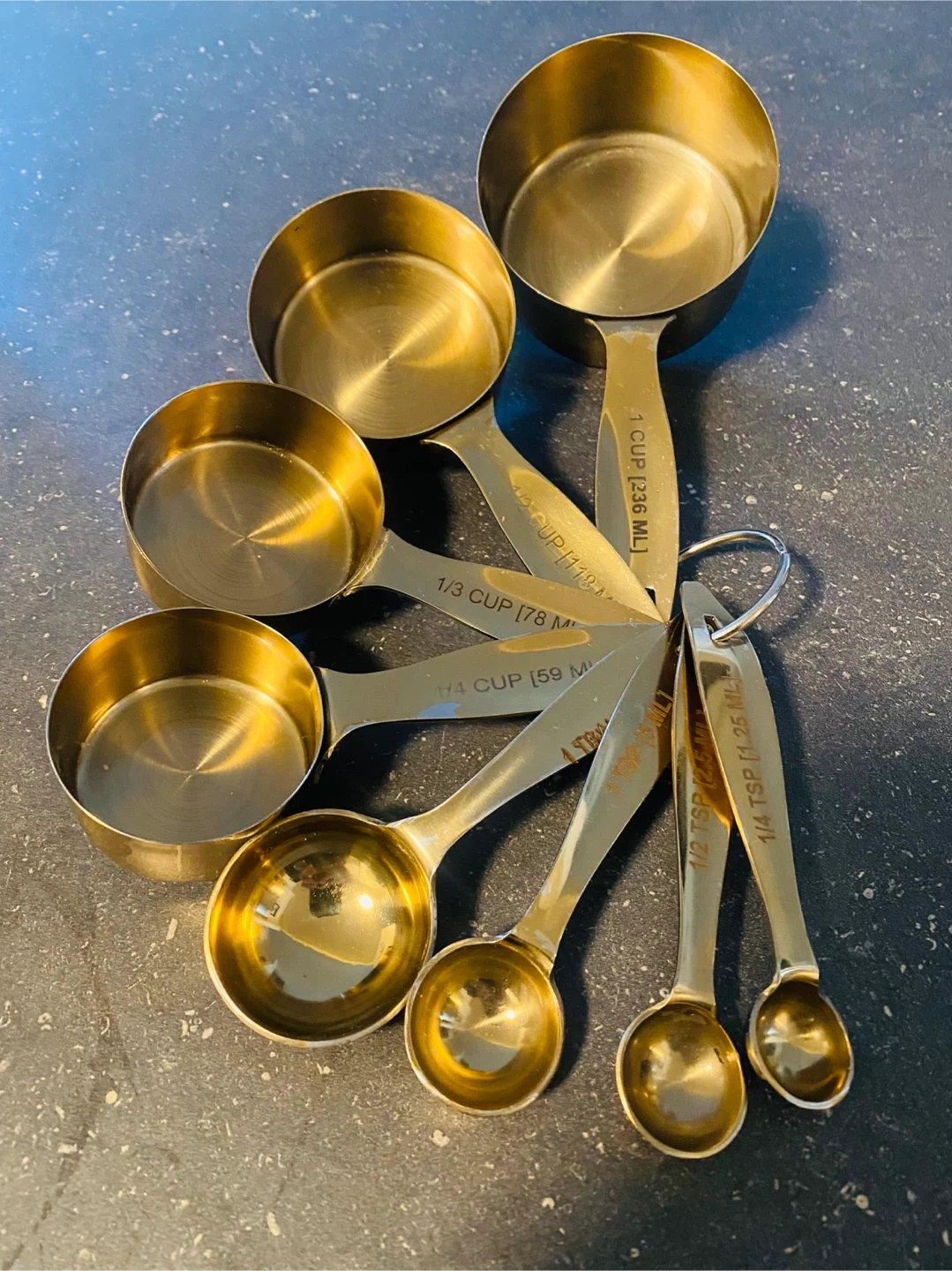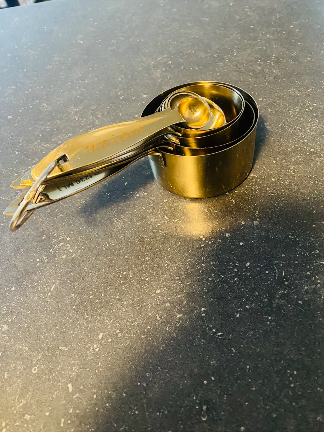 Selling a set of gold-coloured measuring cups and spoons! The set includes various sizes, from 1/4 tsp to 1 cup, all held together with a ring. They're in great condition and ready to help with your baking and cooking needs. Pet free home Cash only
