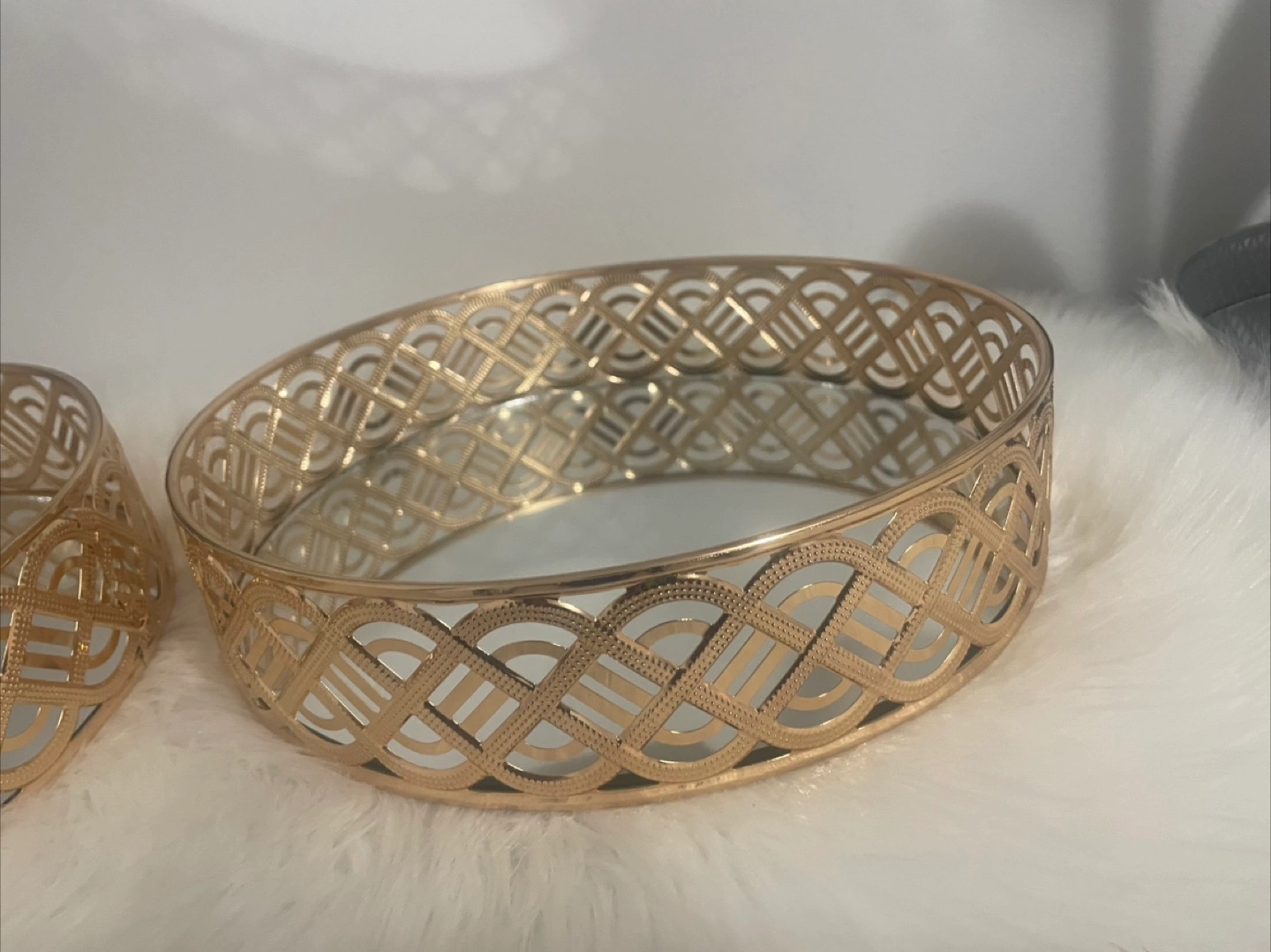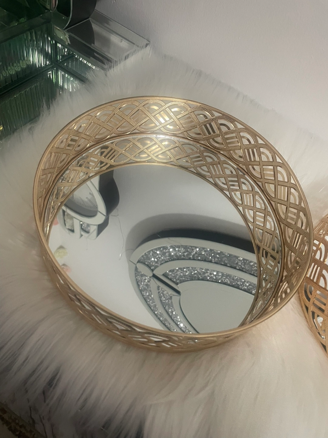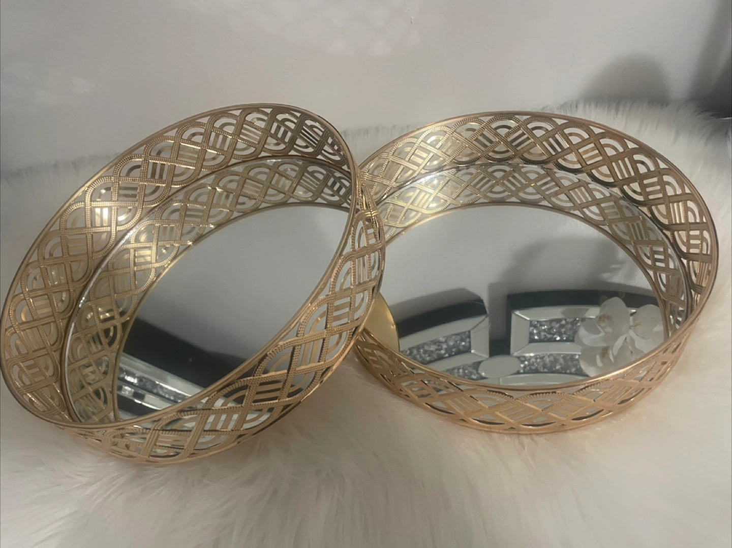 Selling a set of two decorative mirror trays. These trays feature a beautiful gold finish and intricate lattice design around the edges. They're perfect for adding a touch of elegance to your home decor!