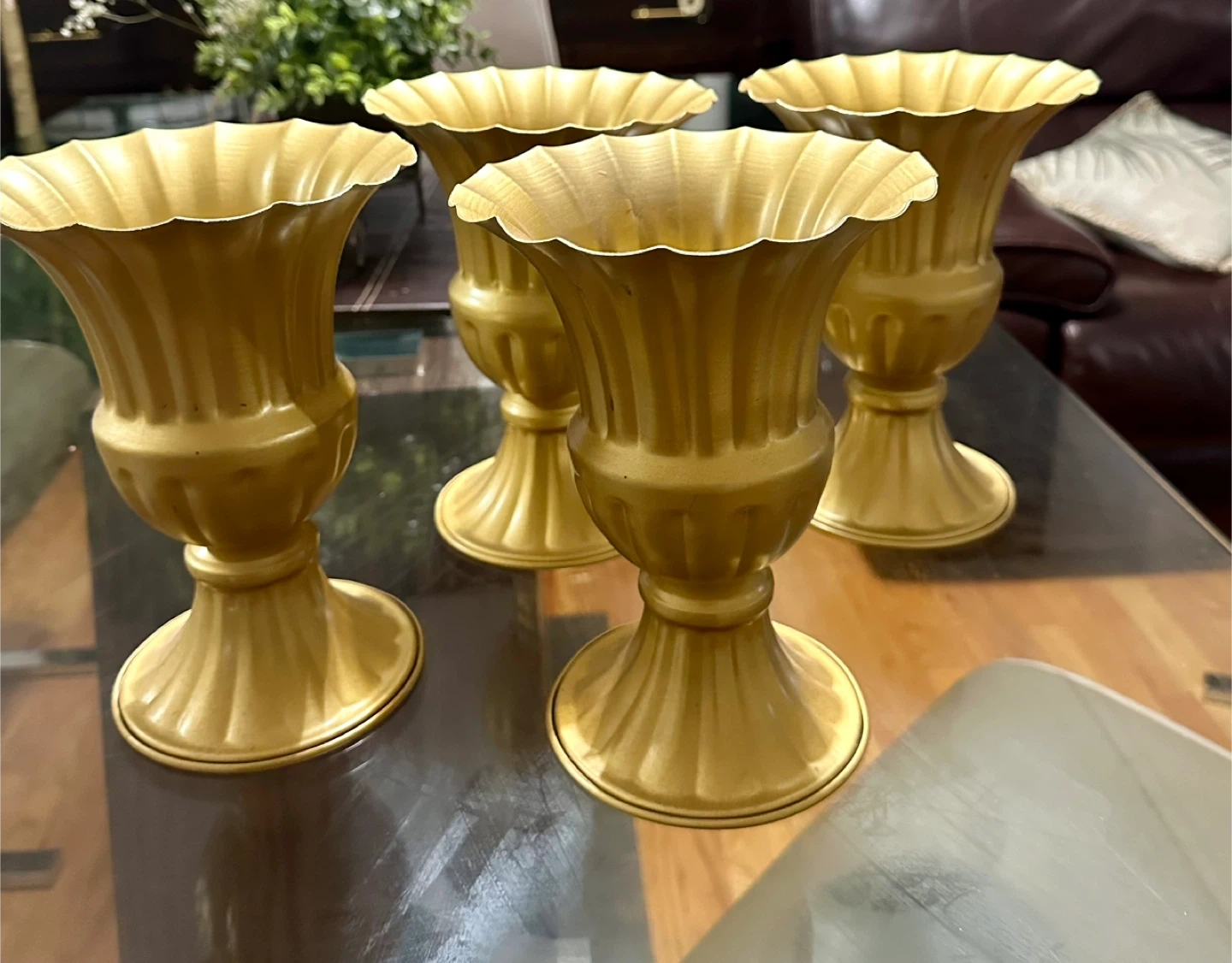 Selling a set of four gold decorative vases. They add a touch of elegance to any room. Perfect for displaying flowers or as standalone decor!