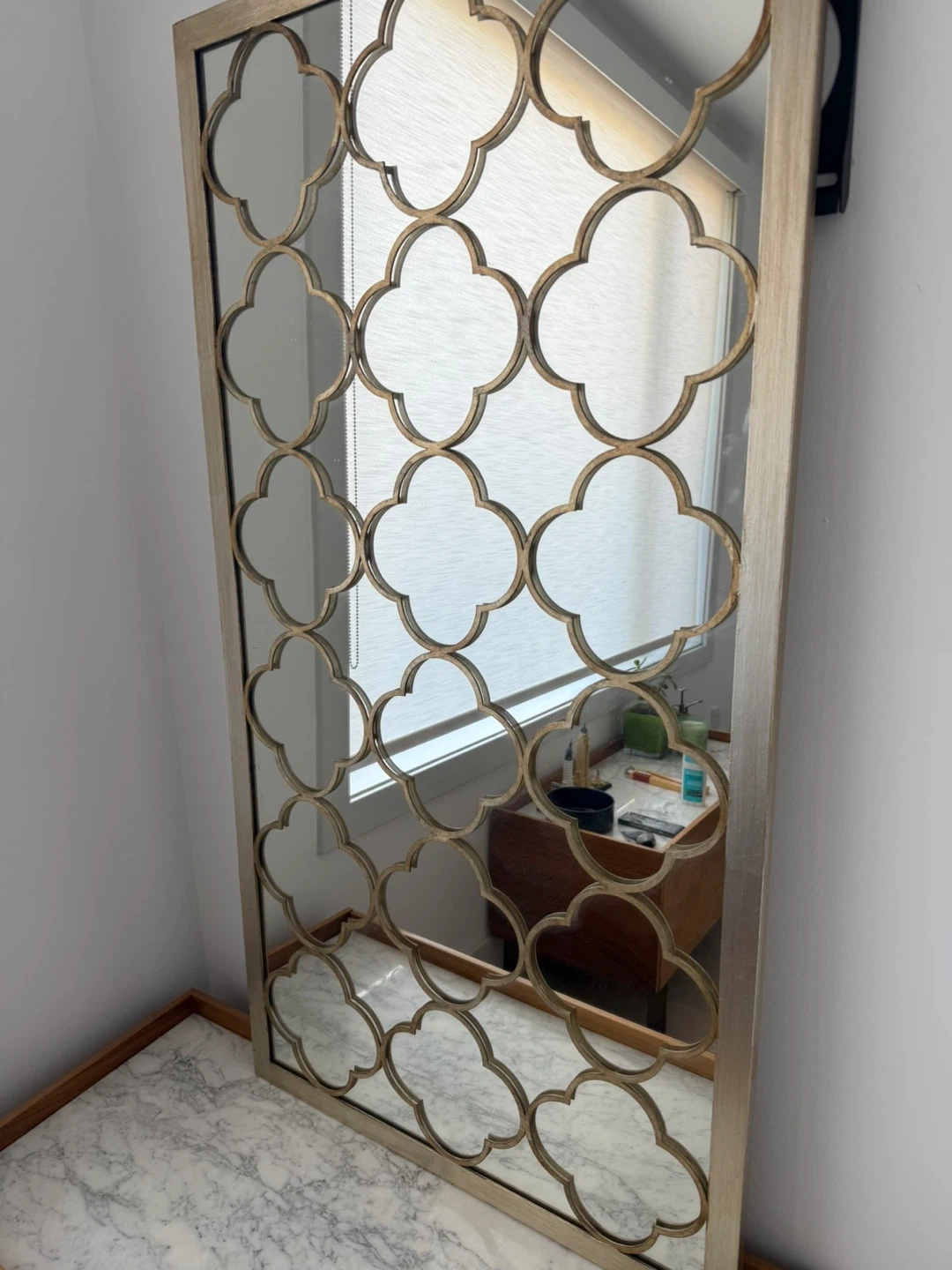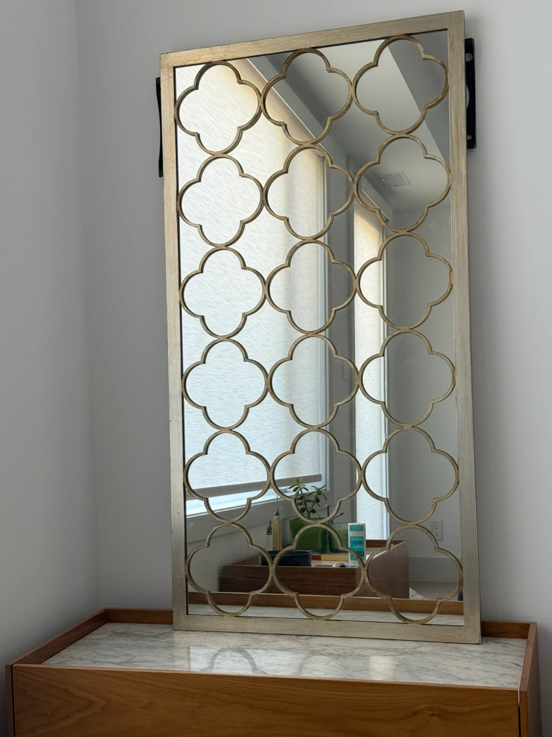 Selling a lovely decorative wall mirror with a gold frame. It's in great condition and would look perfect in any room of the house! The quatrefoil design is really eye-catching and adds a touch of elegance to your space P.s. the mirrors come as a pair, $65 each.