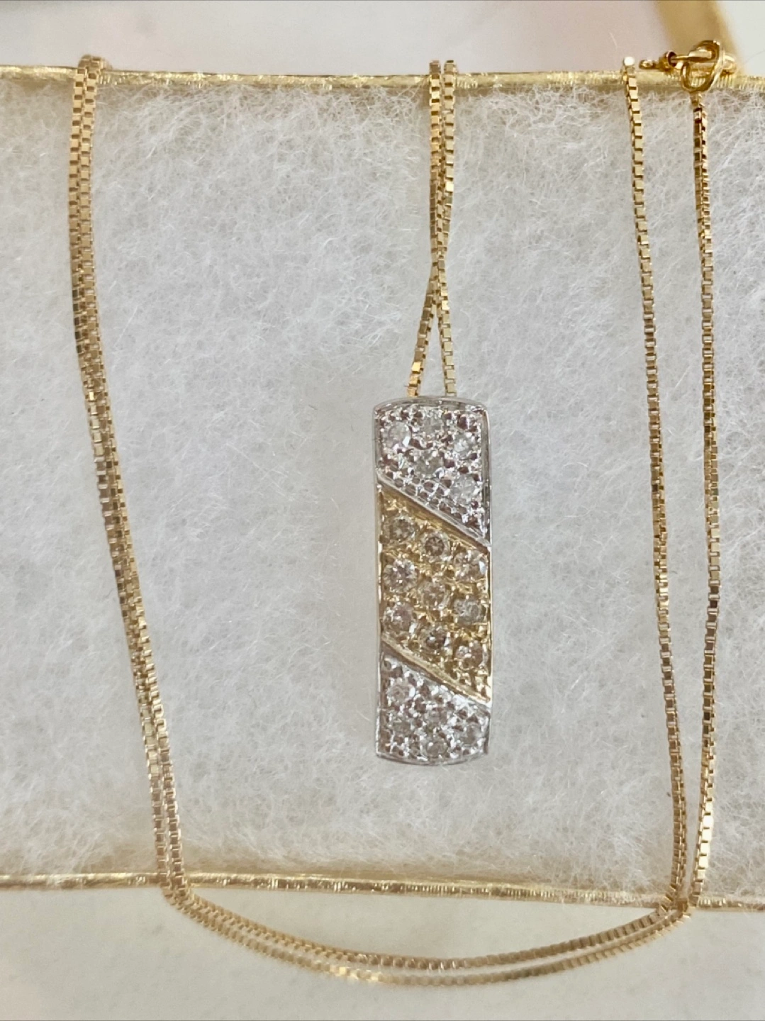 A beautiful sokid 10k yellow and white gold chain pendant and necklace with a diamond . The pendant has a unique design with two colours. It's in New condition and ready to wear