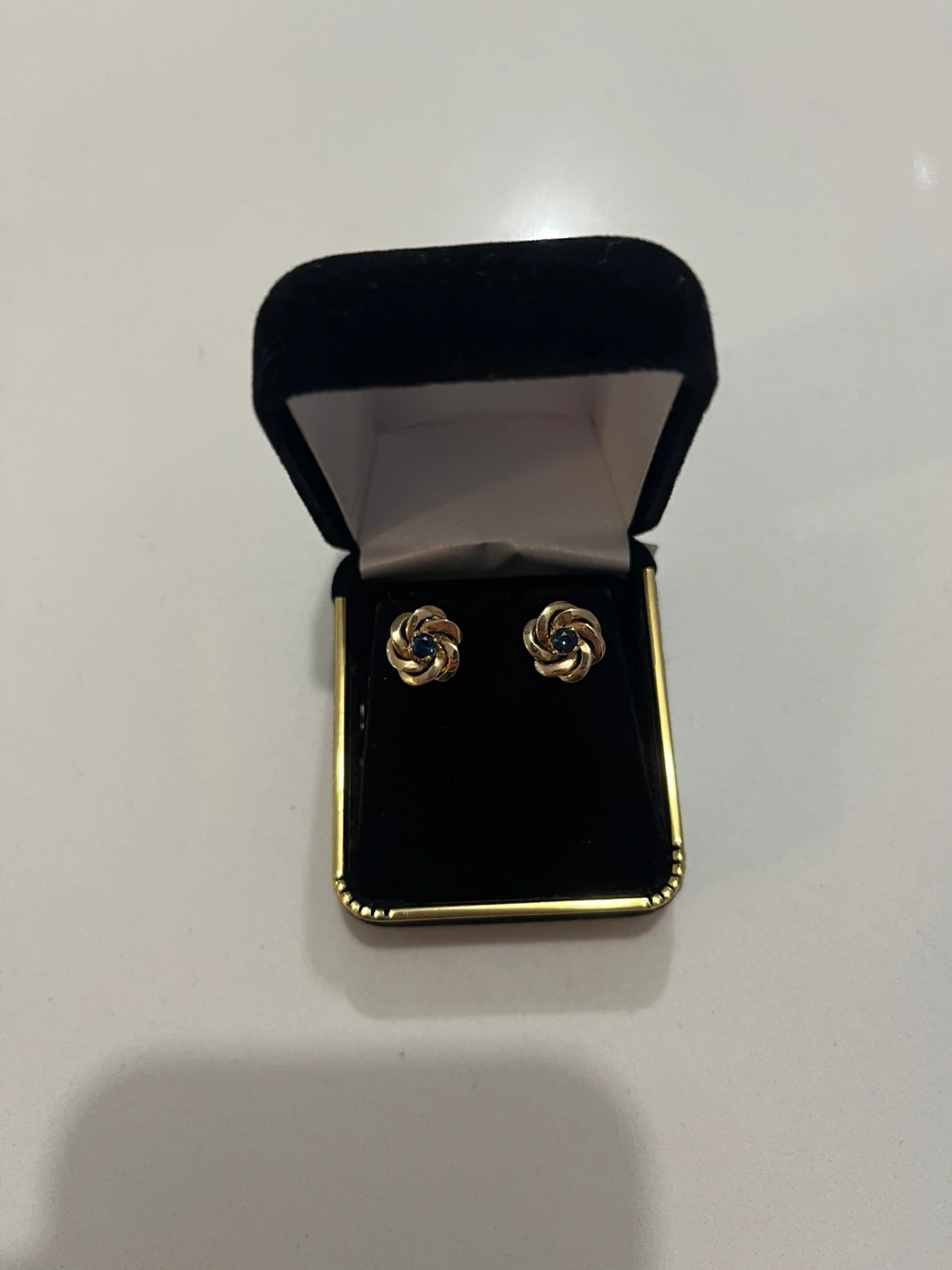 These are a pair of gold flower stud earrings. They come in a black velvet box with gold trim. They are in excellent condition and ready to wear! Gold 14k