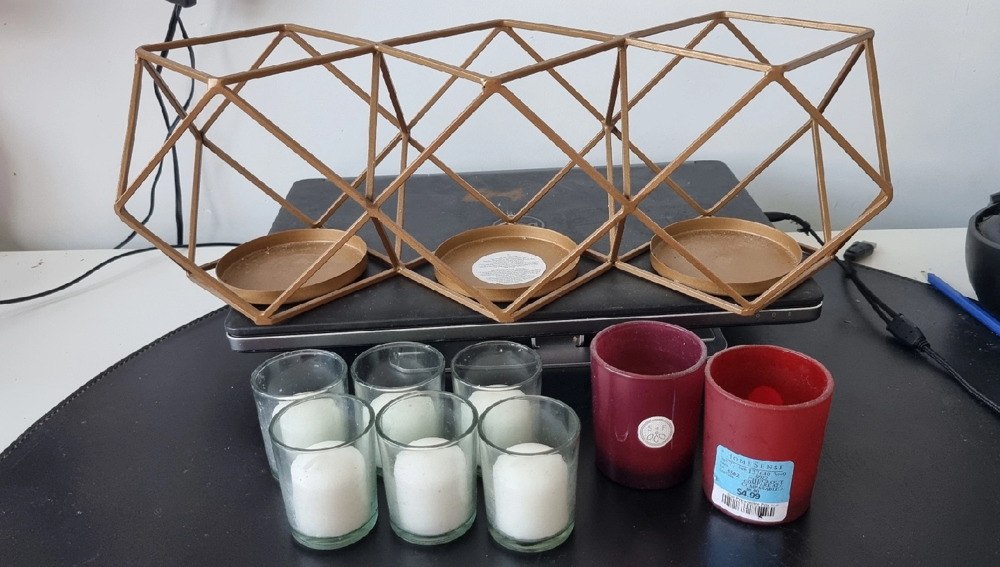 Selling a gold geometric candle holder. It comes with several clear glass votive candles, plus two red glass candle holders. The red candle holders are from Homesense and were originally $4.99 each! Perfect for adding a touch of warmth to any room