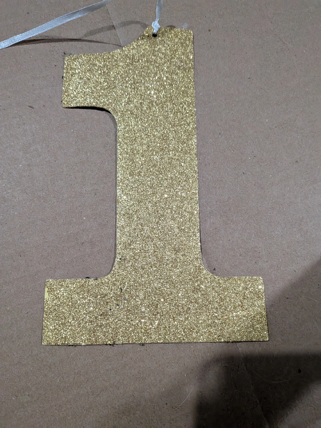A sparkly gold glitter number one decoration! Perfect for a first birthday party or any celebration where you need a number one. It comes with a string for easy hanging