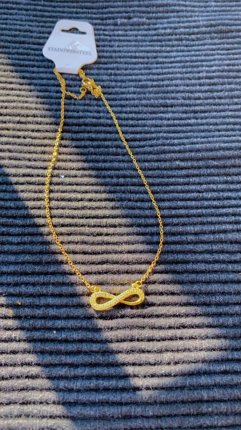 Selling a lovely gold-coloured infinity pendant necklace! It's made of stainless steel and in great condition. Perfect for adding a touch of elegance to any outfit!