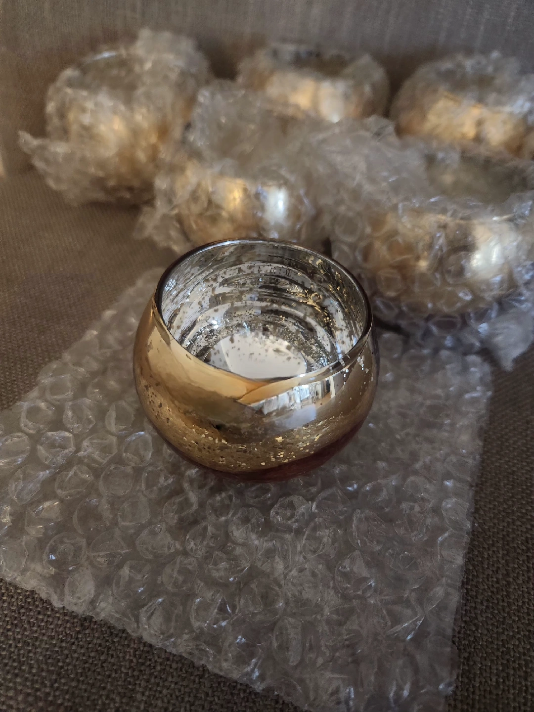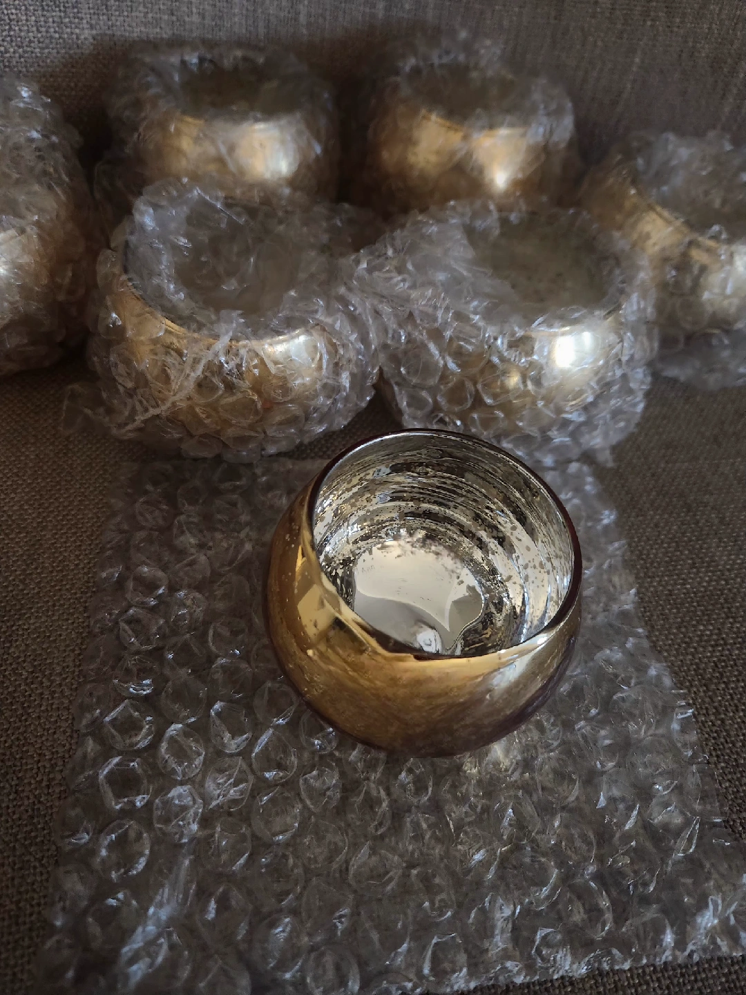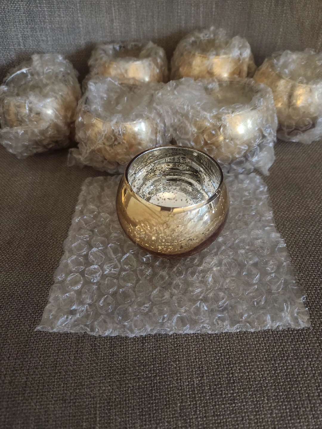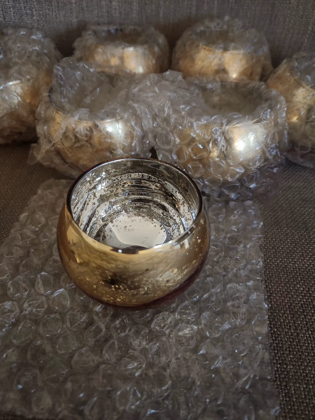 Selling a set of 7 gold mercury glass votive candle holders that measure 2 inches high and 2.5 inches wide. They add a lovely warm glow when lit. All are brand new and I just removed one from the bubble wrap for the photos. I also have some extra tea candles which I can include if you like. These candle holders are perfect for creating a cozy atmosphere in any room!