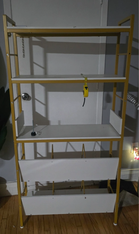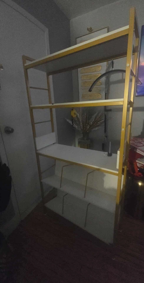 Here's a shelf unit with a gold metal frame and white shelves. It's in good condition and ready to organize your space! The shelves provide ample storage and display space. NO DAMAGES NO LONGER HAVE SPACE FOR IT MUST GO ASAP! SERIOUS INQUIRIES ONLY PLEASE