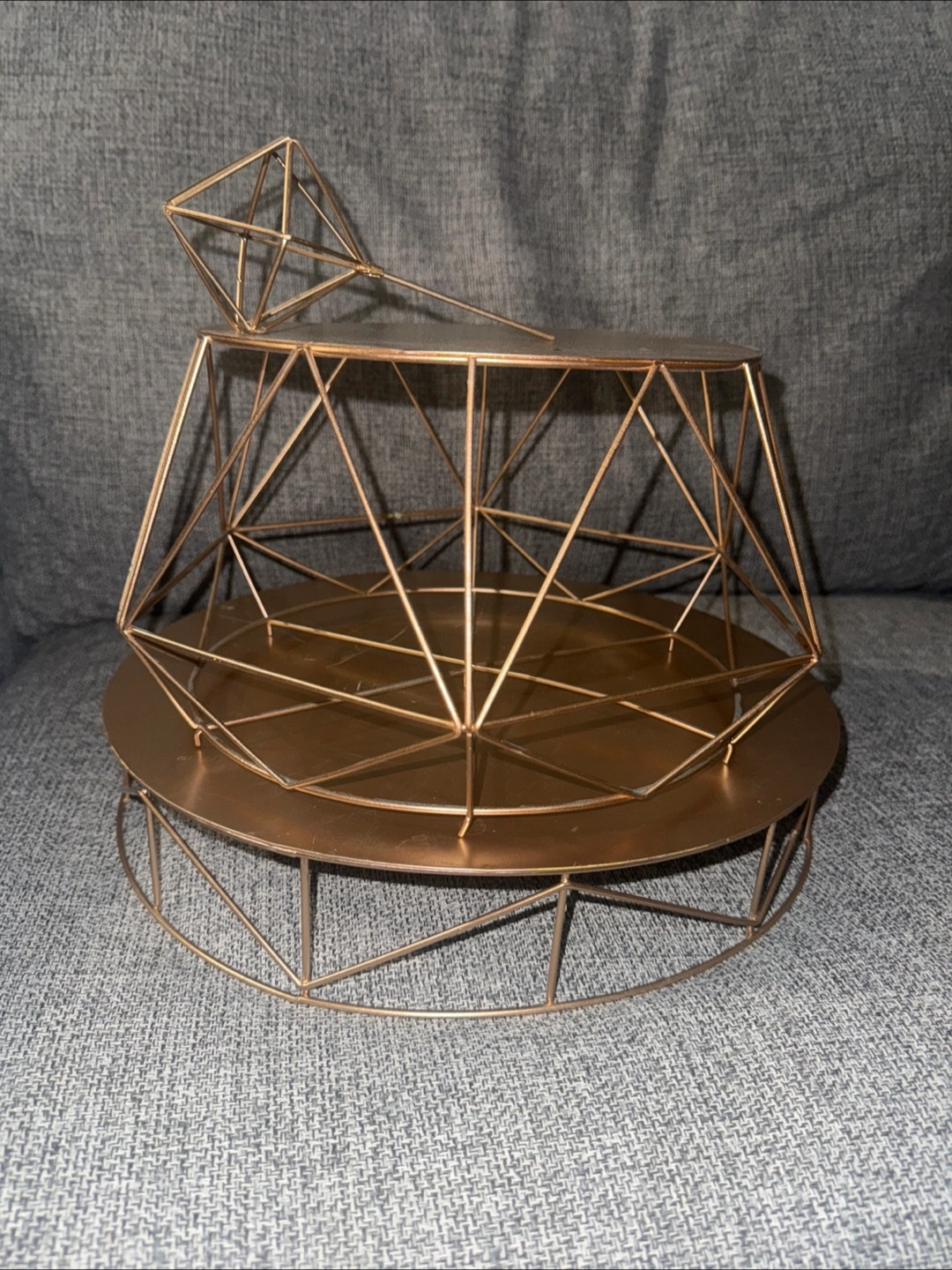 Selling a stylish gold metal cake stand! It's perfect for displaying cakes, desserts, or even floral arrangements. The geometric design adds a modern touch to any table setting. It's sturdy and in great condition, ready to elevate your next event or celebration