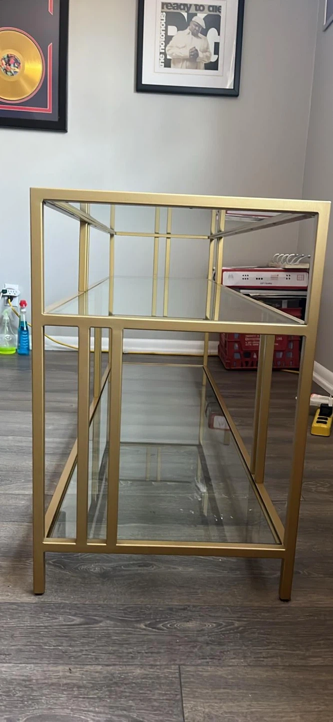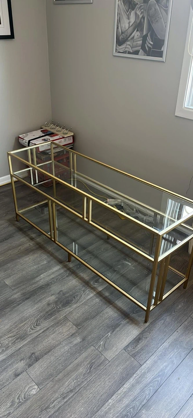 Selling a stylish console table featuring a gold metal frame and glass shelves. It's in great shape and would make a lovely addition to any living room or entryway. Perfect for displaying decor or storing items!