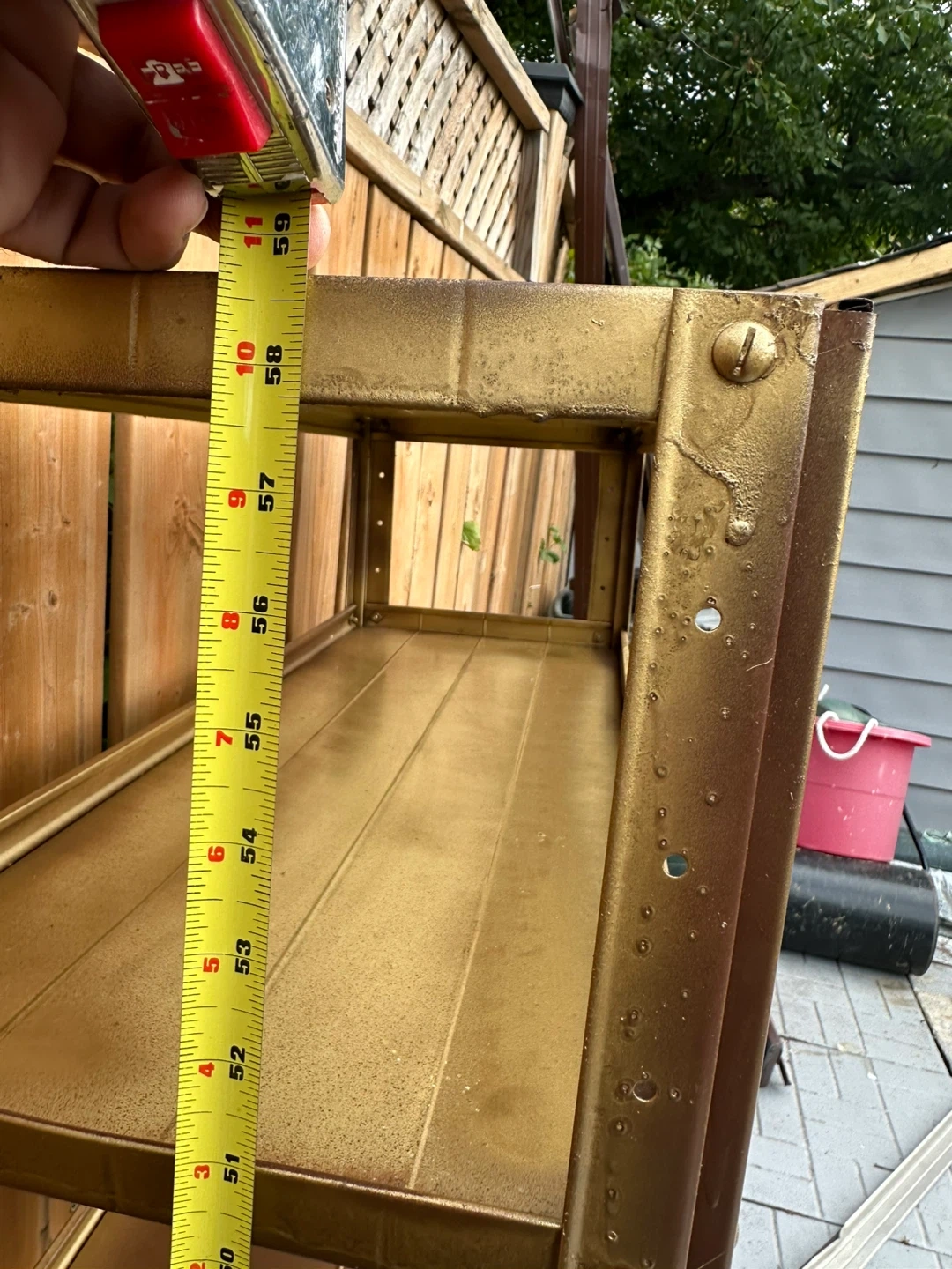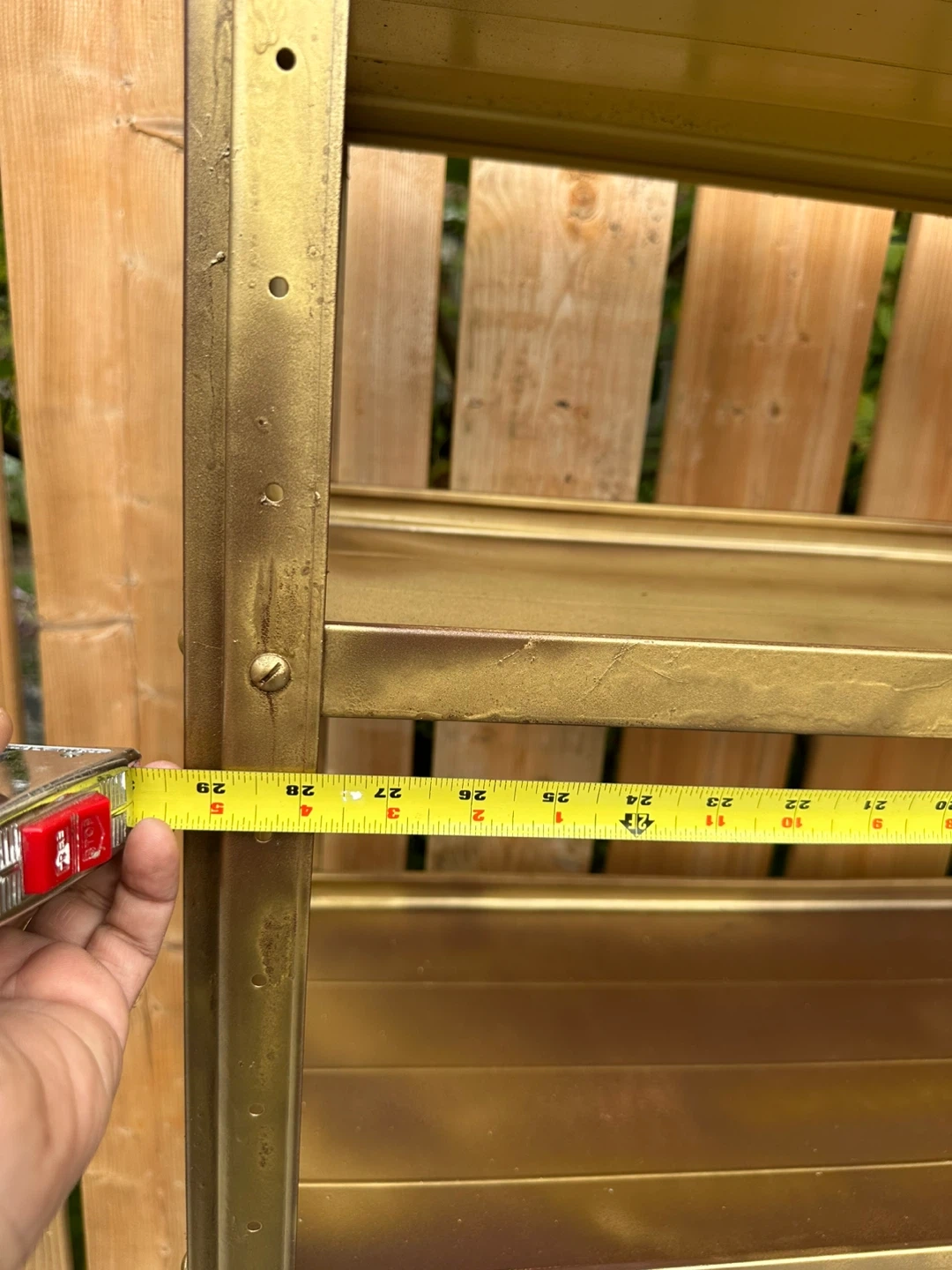 L:59 D: 11 W : 29 a sturdy metal shelf unit with a cool gold finish! It has 7 tiers, perfect for displaying plants, books, or anything you want to show off. Great for adding a touch of industrial style to your space