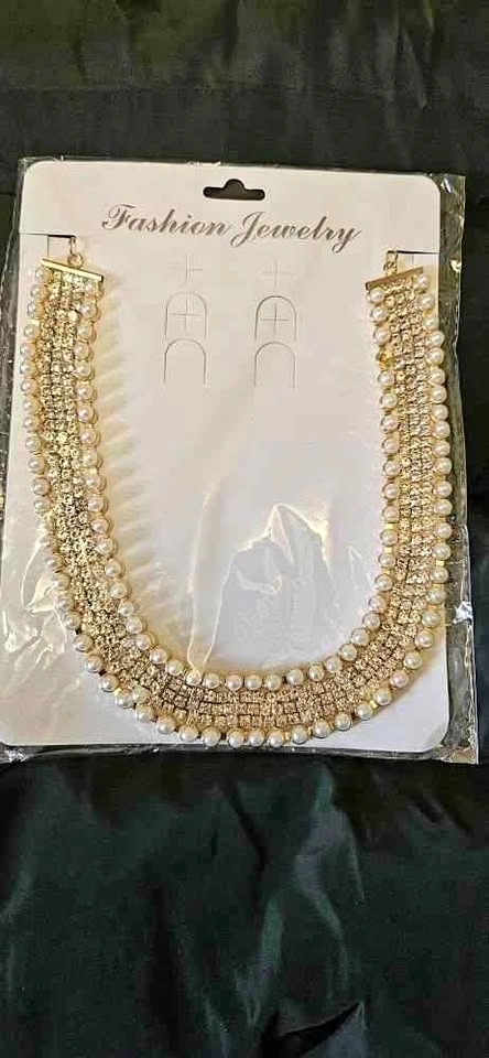 Brand new gold-tone necklace with stunning faux pearls and sparkling rhinestone accents. A perfect statement piece to elevate your outfit for any formal or festive event. Elegant and versatile Still in original packaging – never worn. Ideal gift or addition to any jewelry collection.