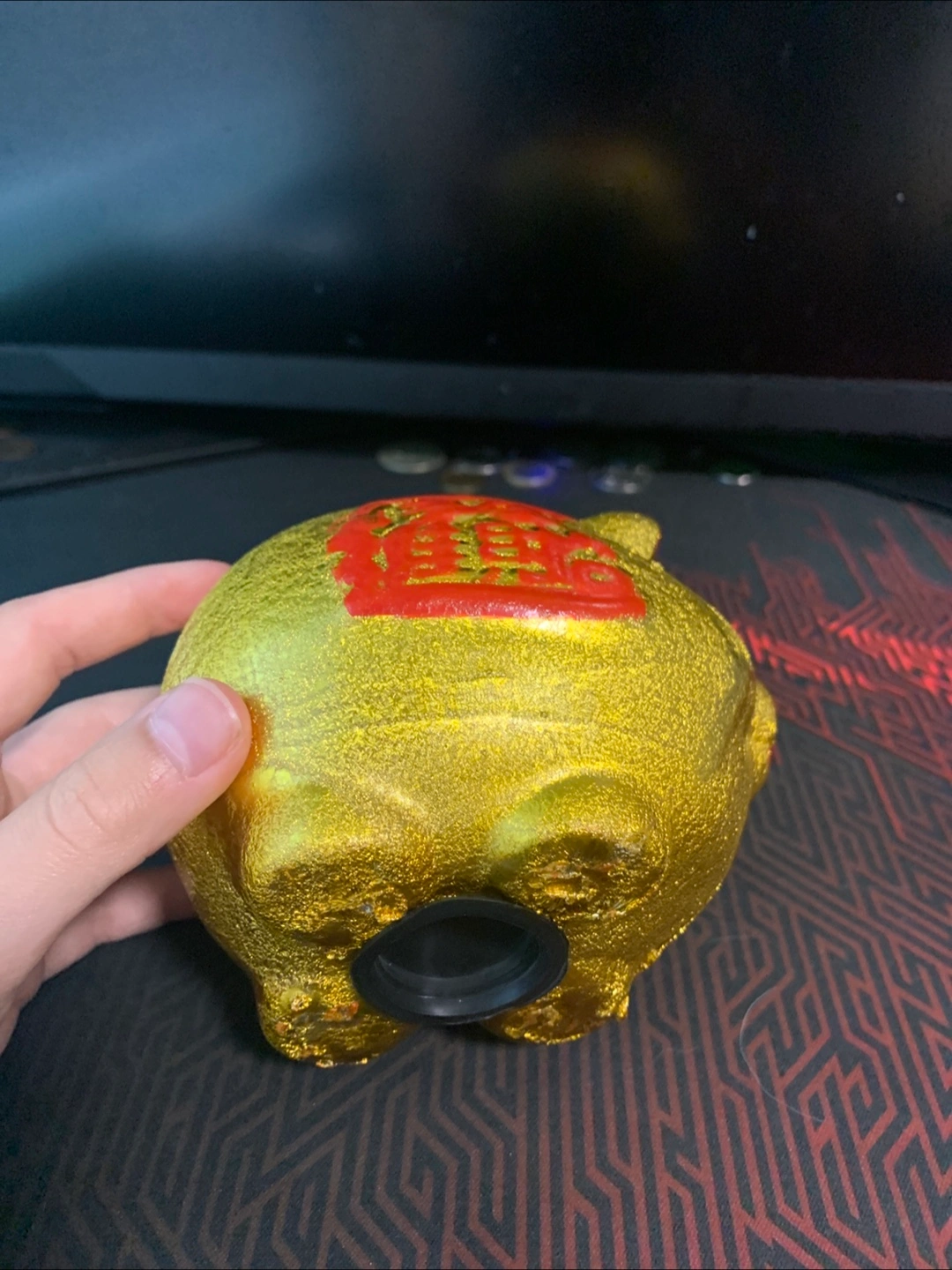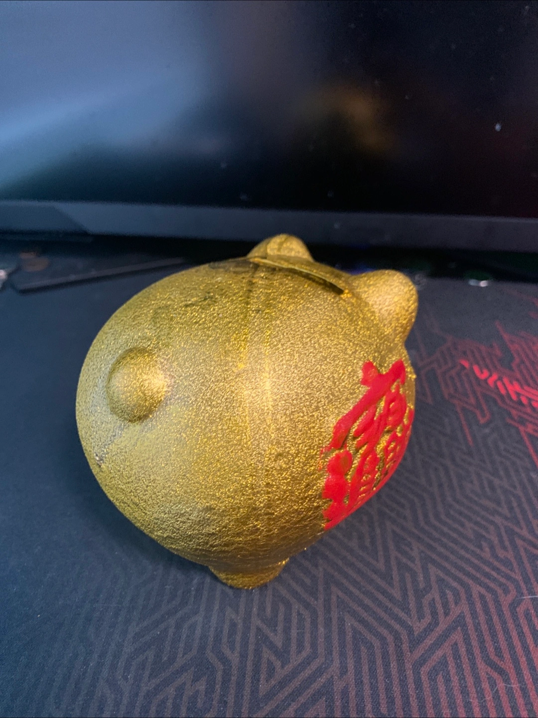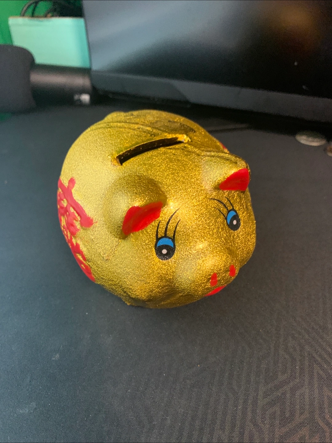 Selling a cute gold piggy bank! It's in great shape and ready to help you save your loonies and toonies. It has a red design on the side and a removable plug on the bottom.