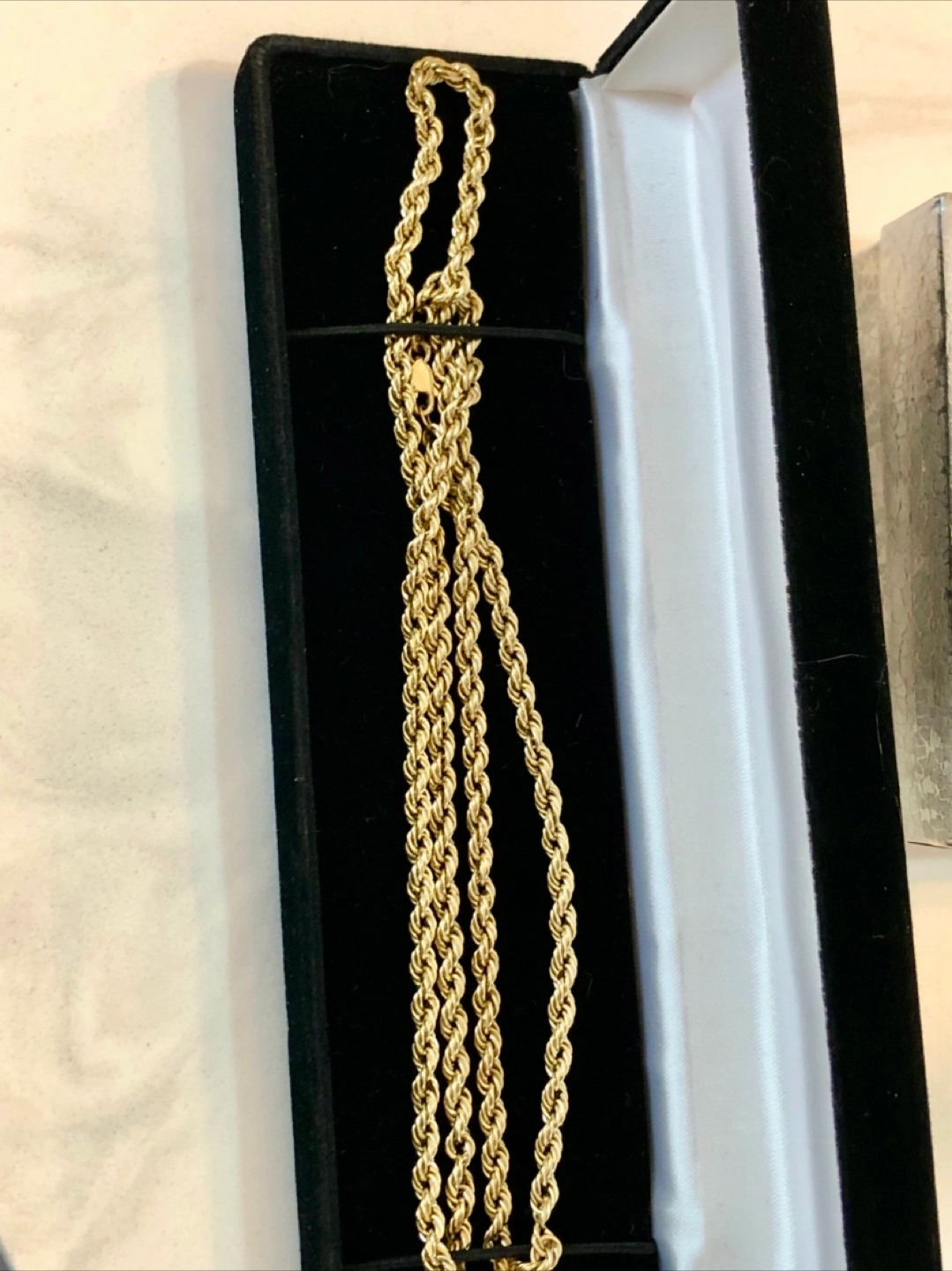 Selling a beautiful 10k solid yellow gold rope chain. It's in great condition and comes with its original box. This elegant chain is perfect for adding a touch of class to any outfit!