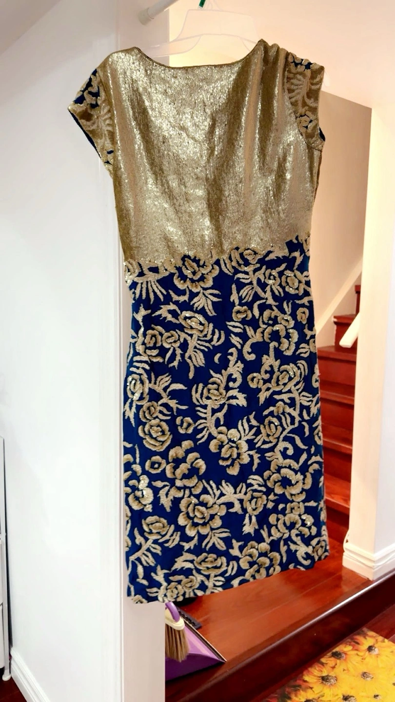 Dress with gold sequined bodice. Floral details on the skirt. The perfect dress to wear out for a fun night.