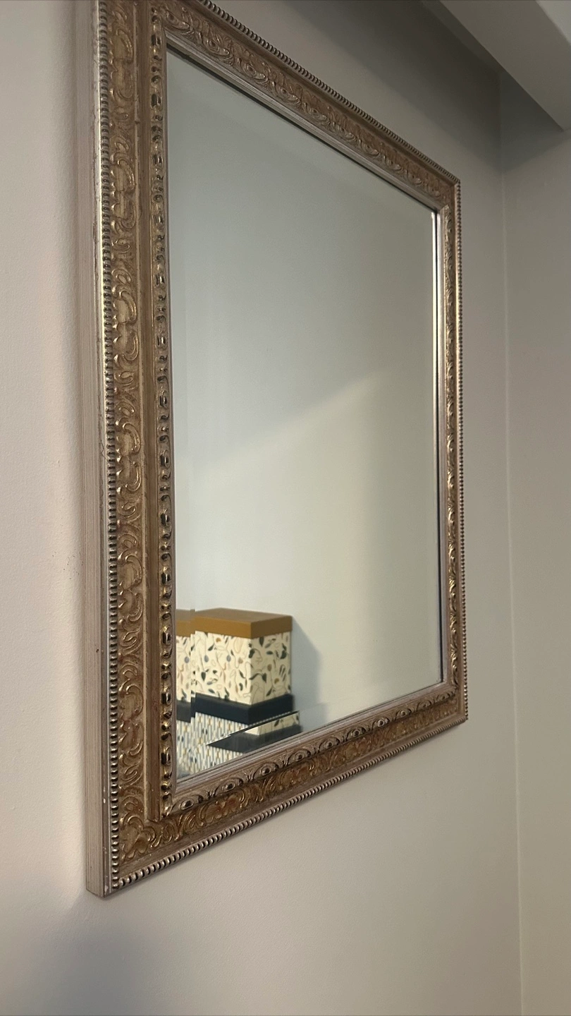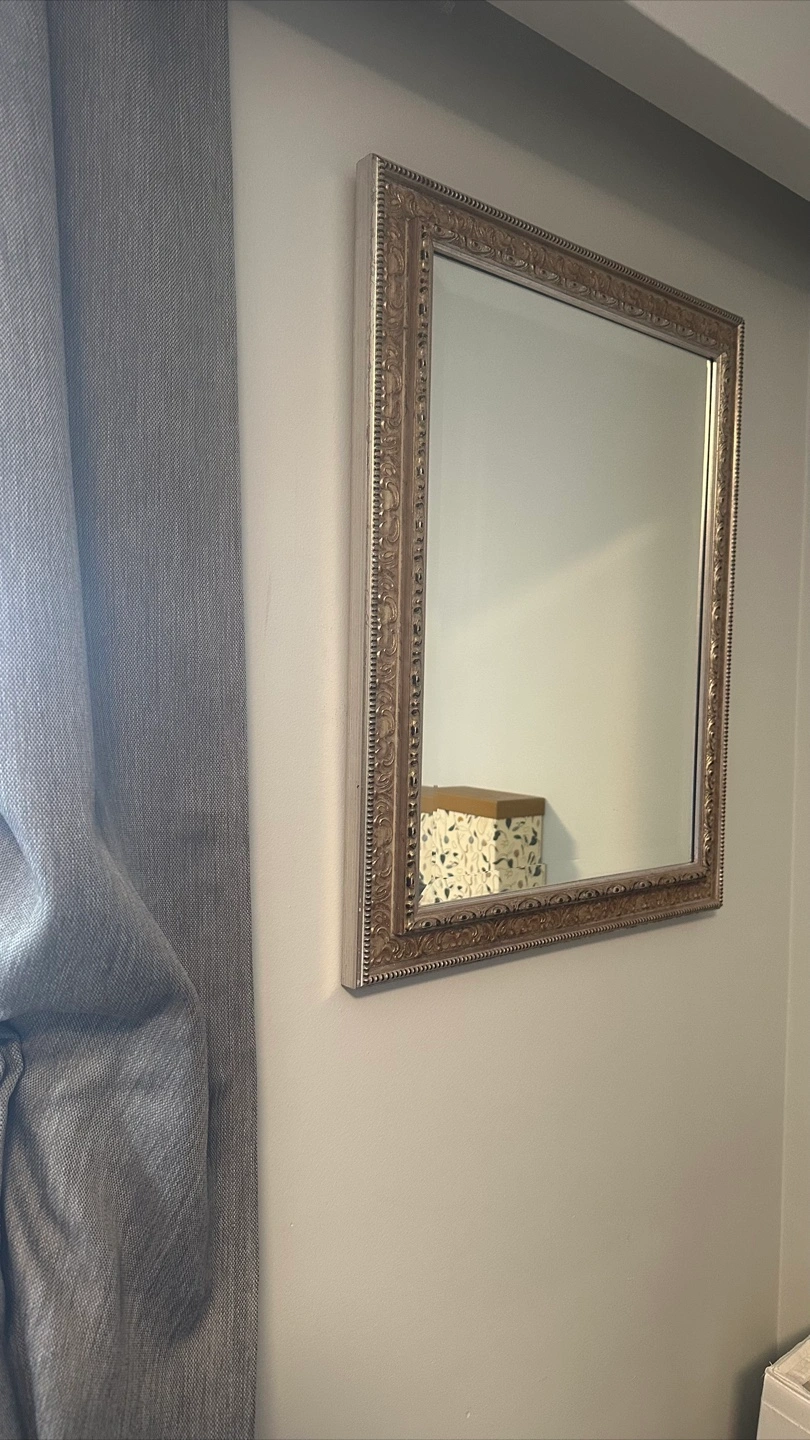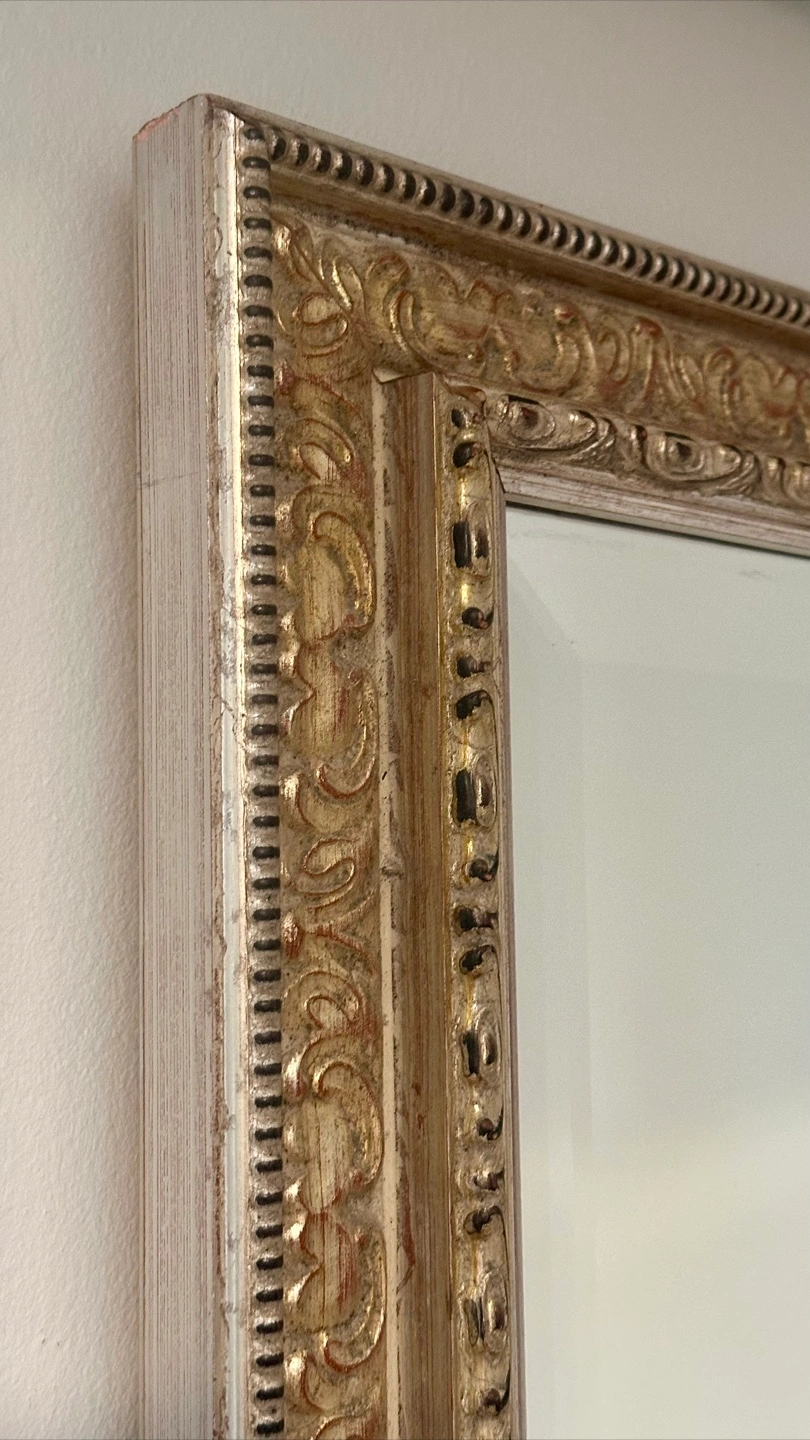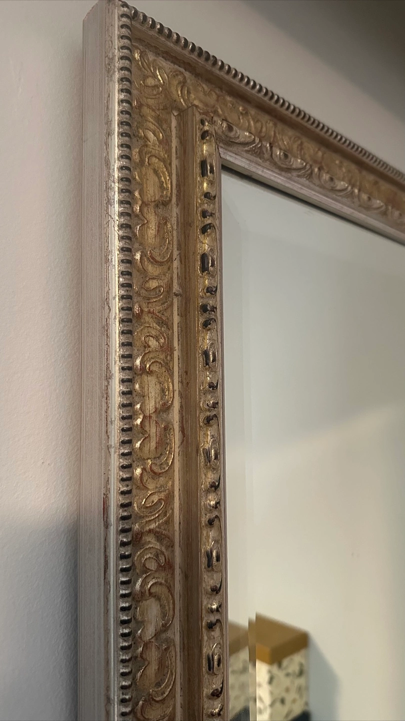 Beautiful ornate mirror. Gold/Silver frame with detailed carvings. Perfect for a bedroom or bathroom. Purchased from a framing store. Very good quality and construction. It is a bit heavy.