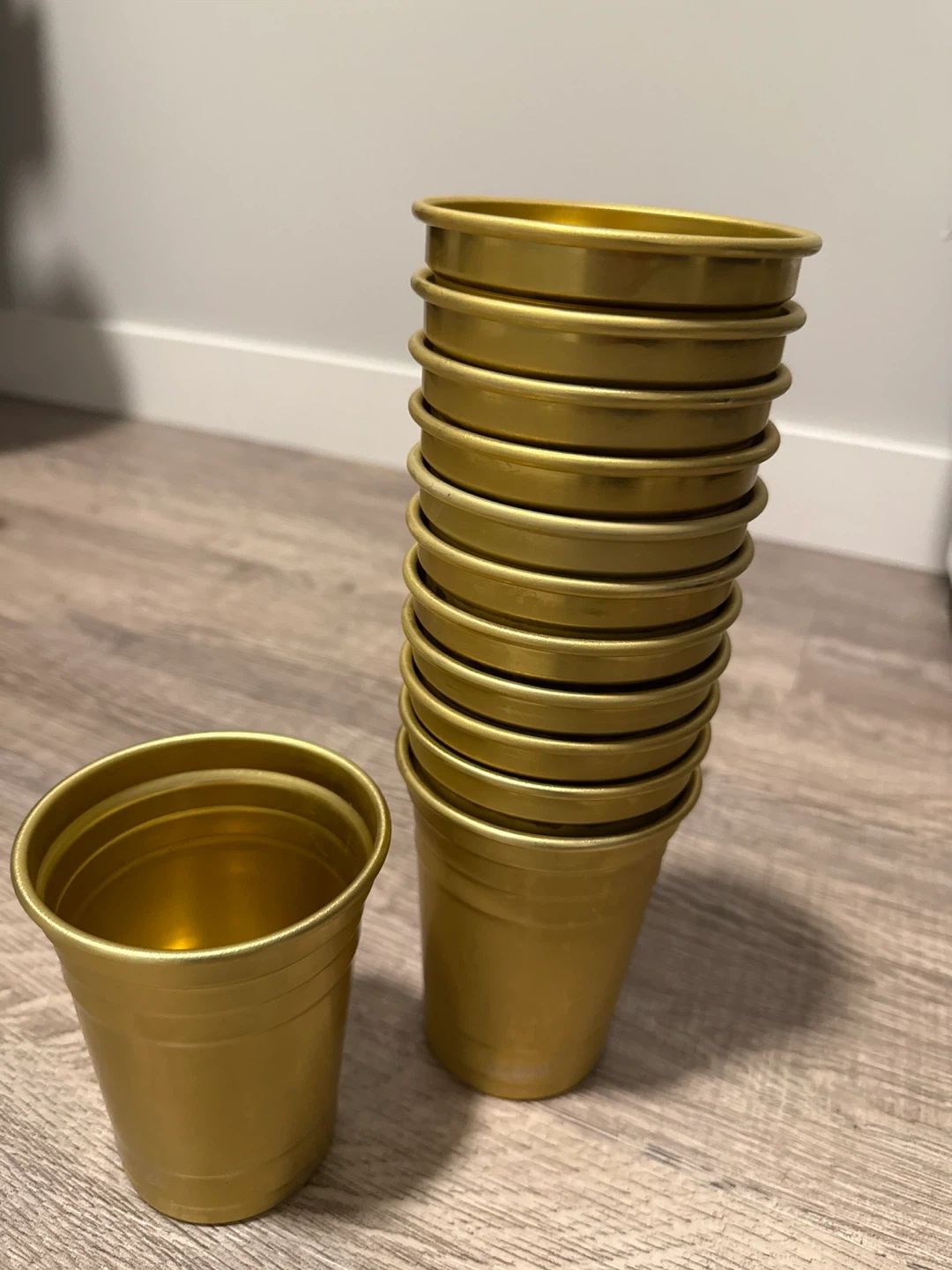 Selling a set of 12 gold-coloured plastic cups! These are perfect for parties, picnics, or any occasion where you need disposable drinkware. They are lightweight and easy to carry around, making them great for outdoor events. Get your hands on these stylish cups today
