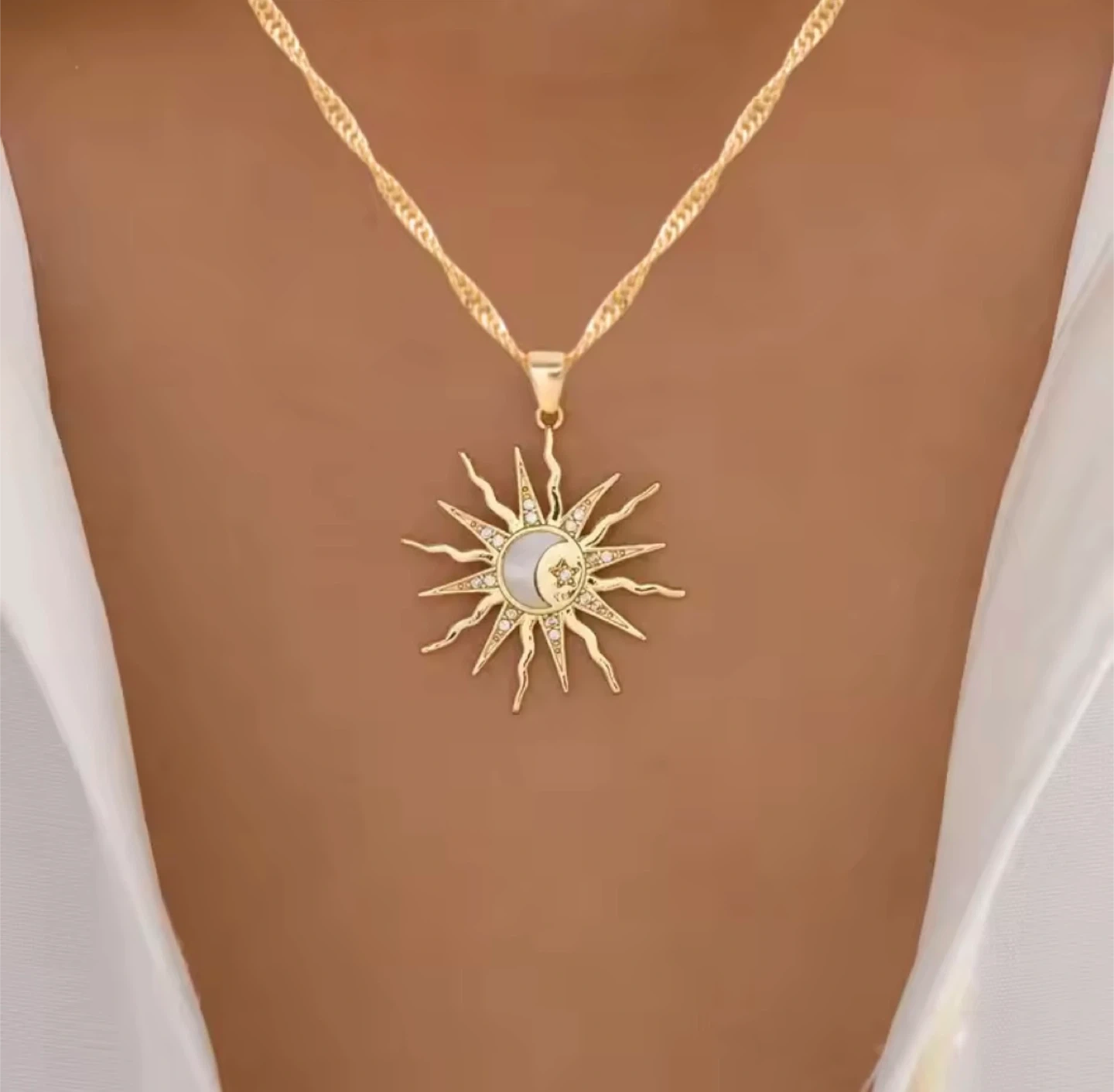 This is a lovely gold-toned necklace with a sun and moon pendant. The chain is about 16 inches long with an adjustable clasp for the perfect fit. The pendant has a unique design with tiny crystals adding a touch of sparkle. It's in great condition and ready to add some celestial charm to your outfits