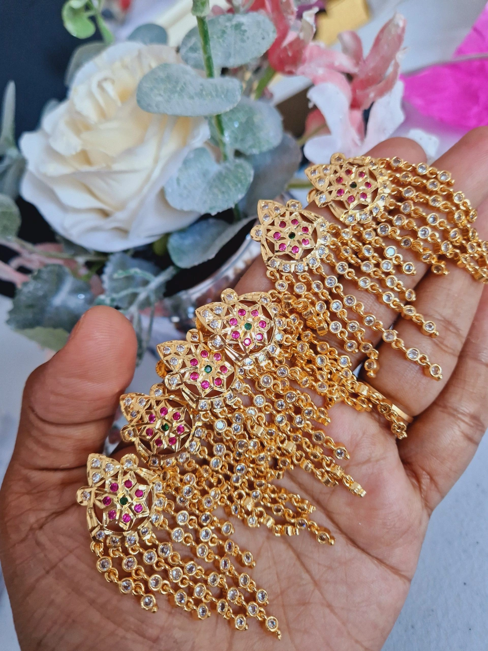 Selling a pair of gold tassel earrings. They feature a floral design with small coloured stones and hanging gold and clear beads. Perfect for adding a touch of elegance to any outfit!