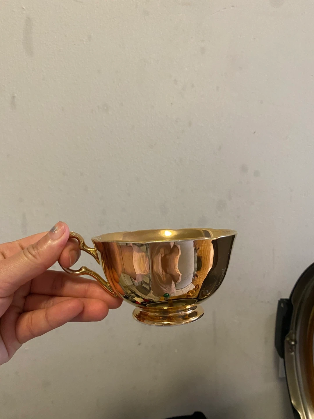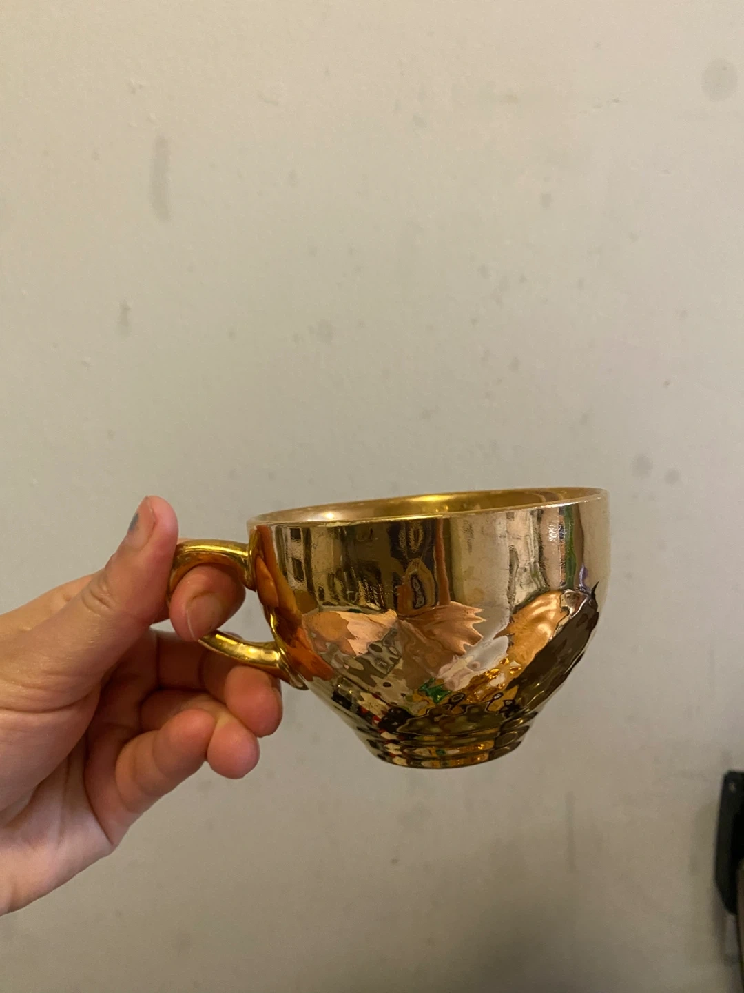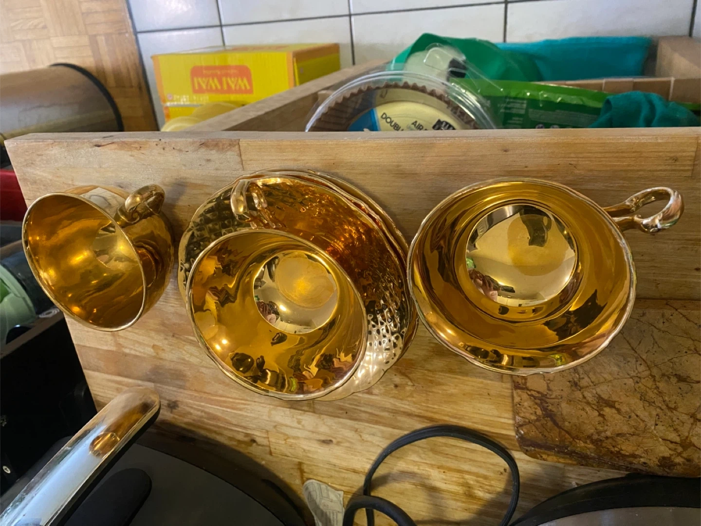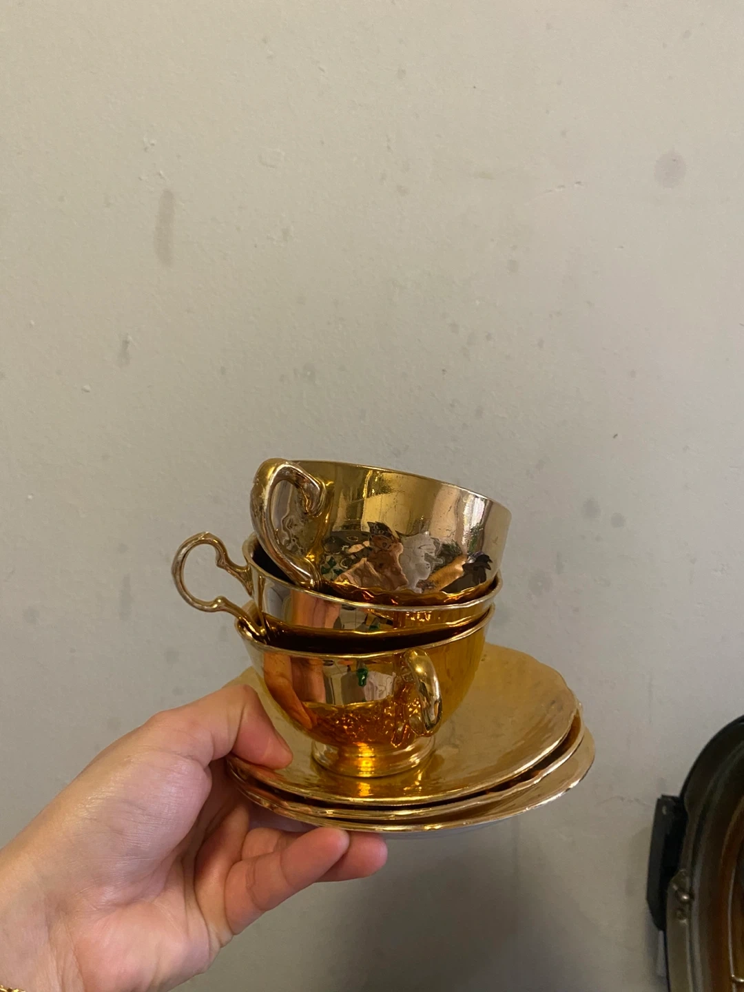 Selling a set of gold tea cups and saucers. They have a lovely reflective finish and would be perfect for a special occasion or to add a touch of elegance to your tea time