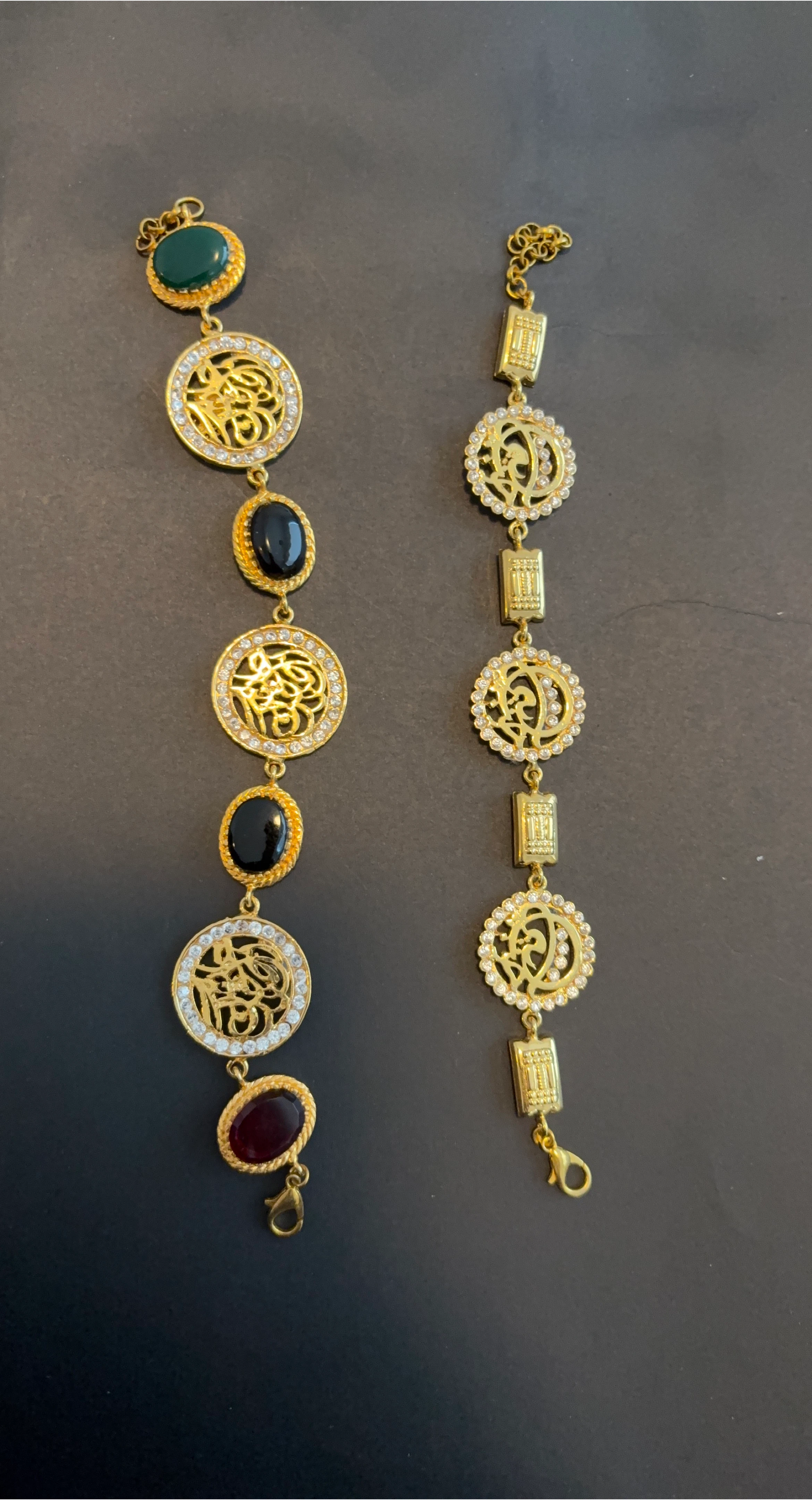 Selling a pair of unique gold-tone fashion bracelets. One features alternating round charms with intricate designs and oval stones in green, black, and red. The other bracelet has similar round charms interspersed with rectangular gold-tone pieces. Both have a lobster clasp closure. They're in great condition and ready to add some flair to your outfit!