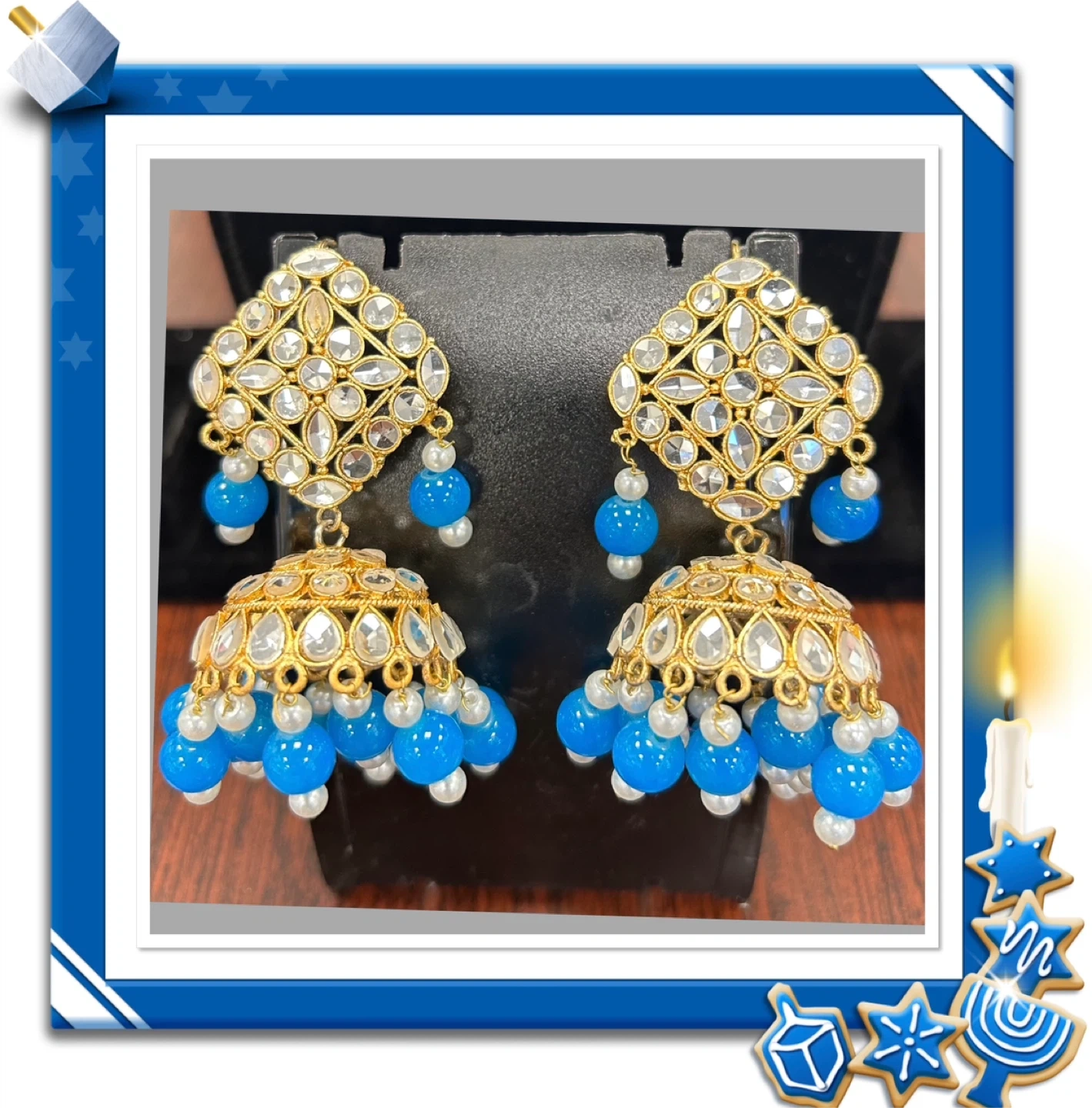 These are a pair of beautiful gold-tone jhumka earrings. They feature a diamond-shaped design with clear stones and are adorned with blue and white beads. Perfect for adding a touch of elegance to any outfit!