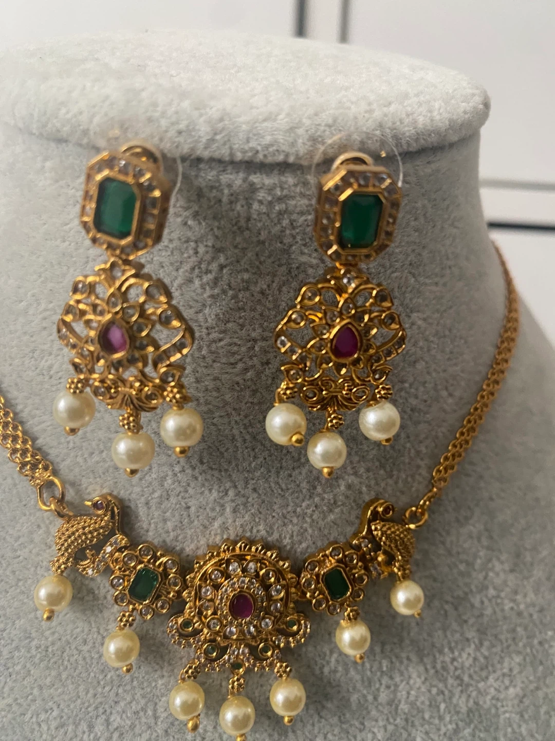 Beautiful gold-tone necklace and earring set featuring green and ruby-coloured stones with pearl accents. Perfect for adding a touch of elegance to any outfit!
