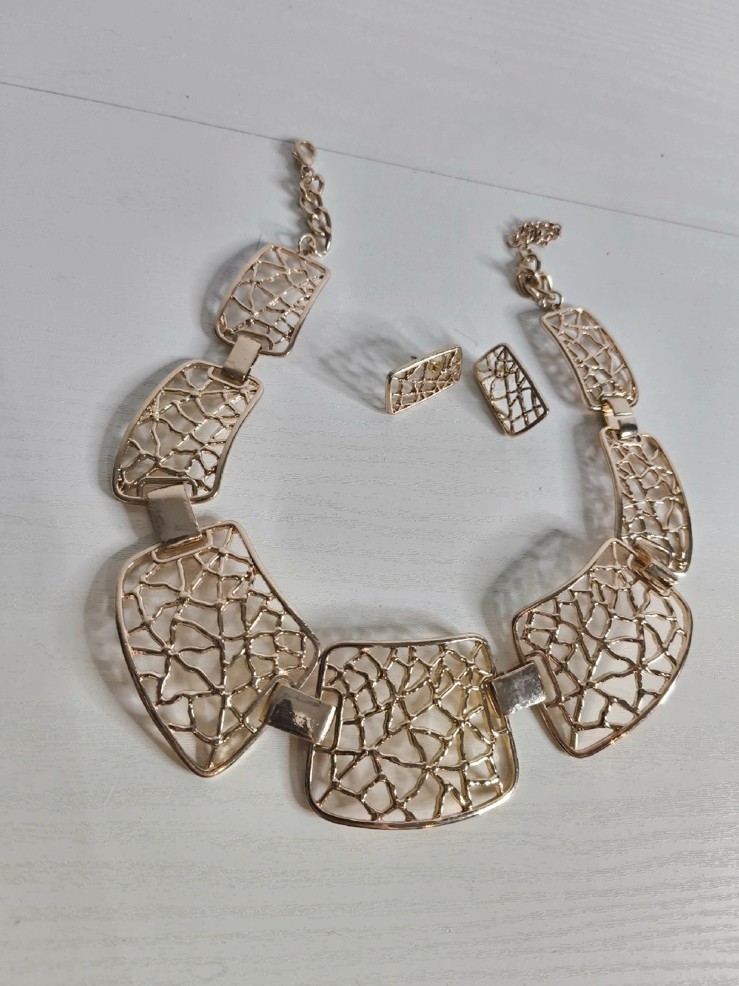Selling a beautiful gold-tone necklace and earring set. The set features a unique geometric design. It's in great condition and ready to add a touch of elegance to your style! Cash only. Pick up at south Surrey area.