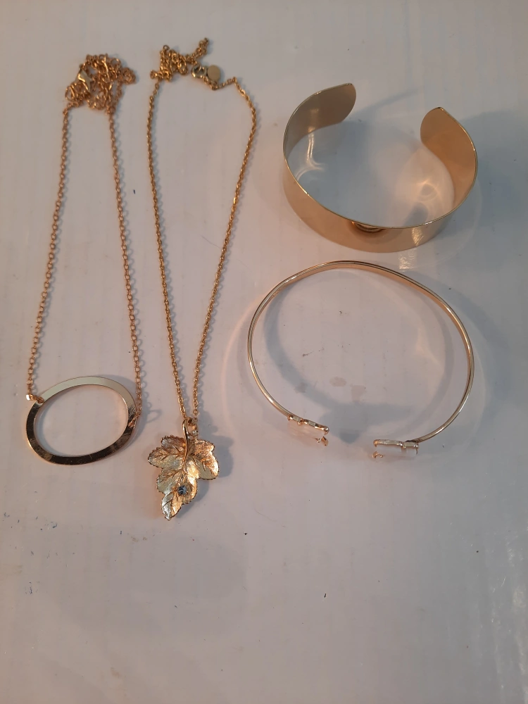 Selling a set of gold-tone jewelry. The set includes two necklaces and two bangles. They are in good condition and ready to add a touch of sparkle to your outfit
