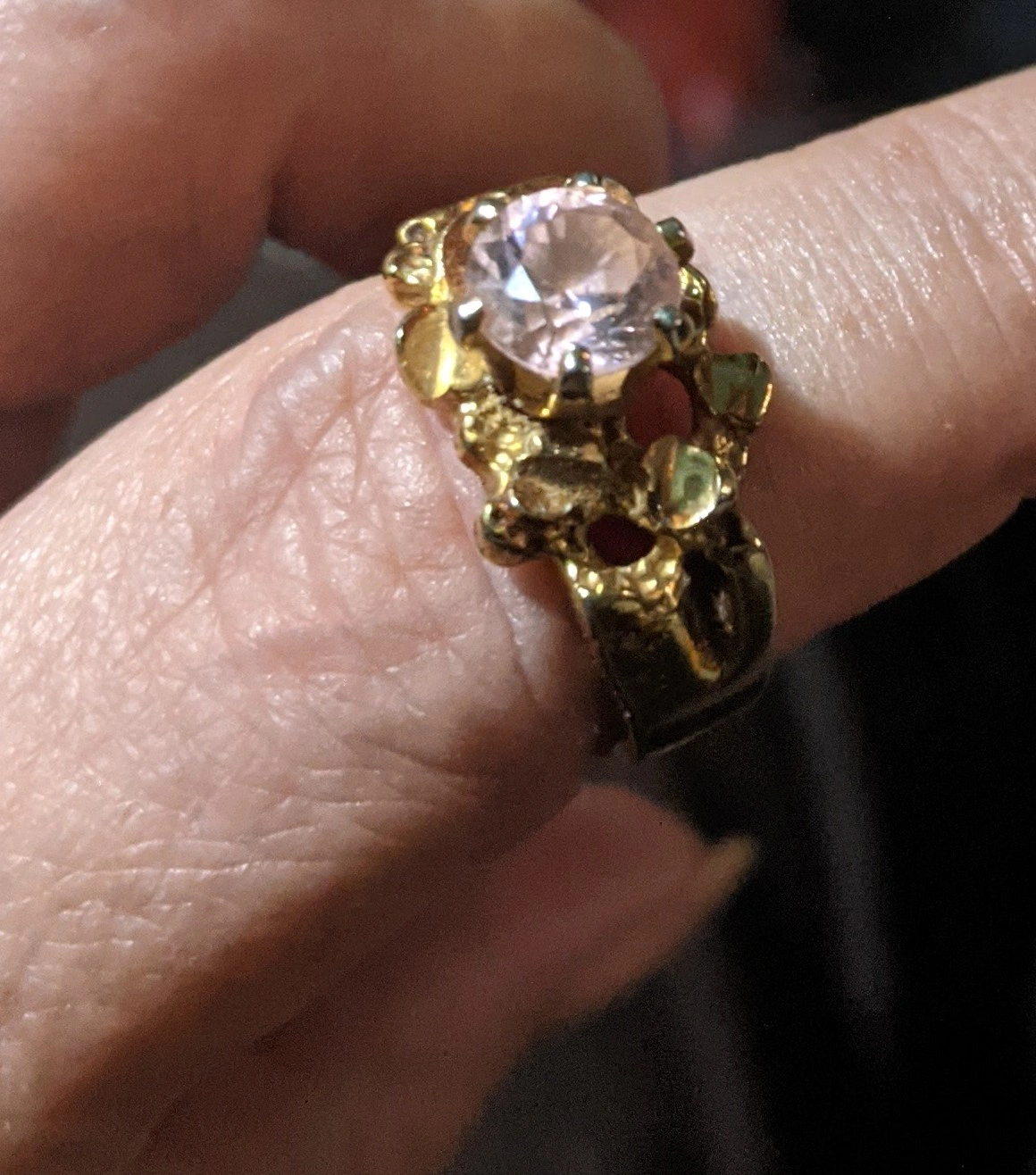 Selling a beautiful gold tone ring featuring a lovely pink stone. It's in good condition and would make a wonderful addition to any jewelry collection!
