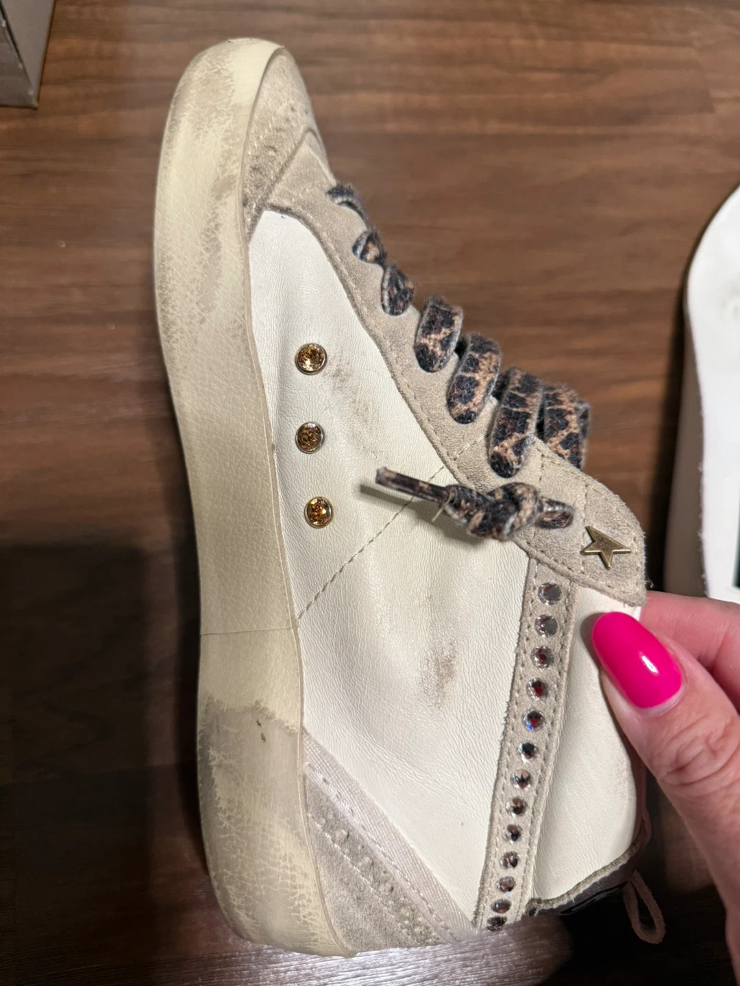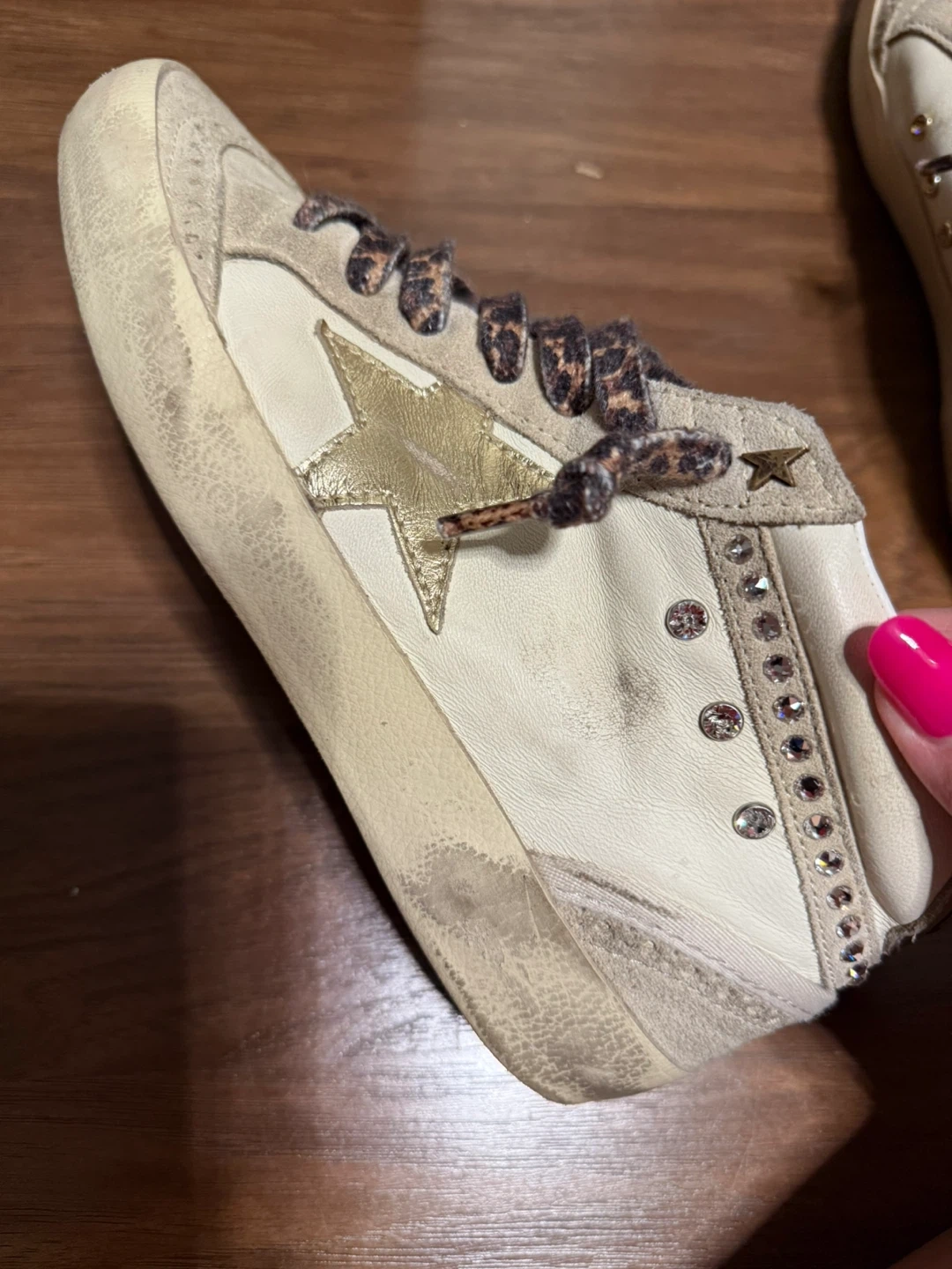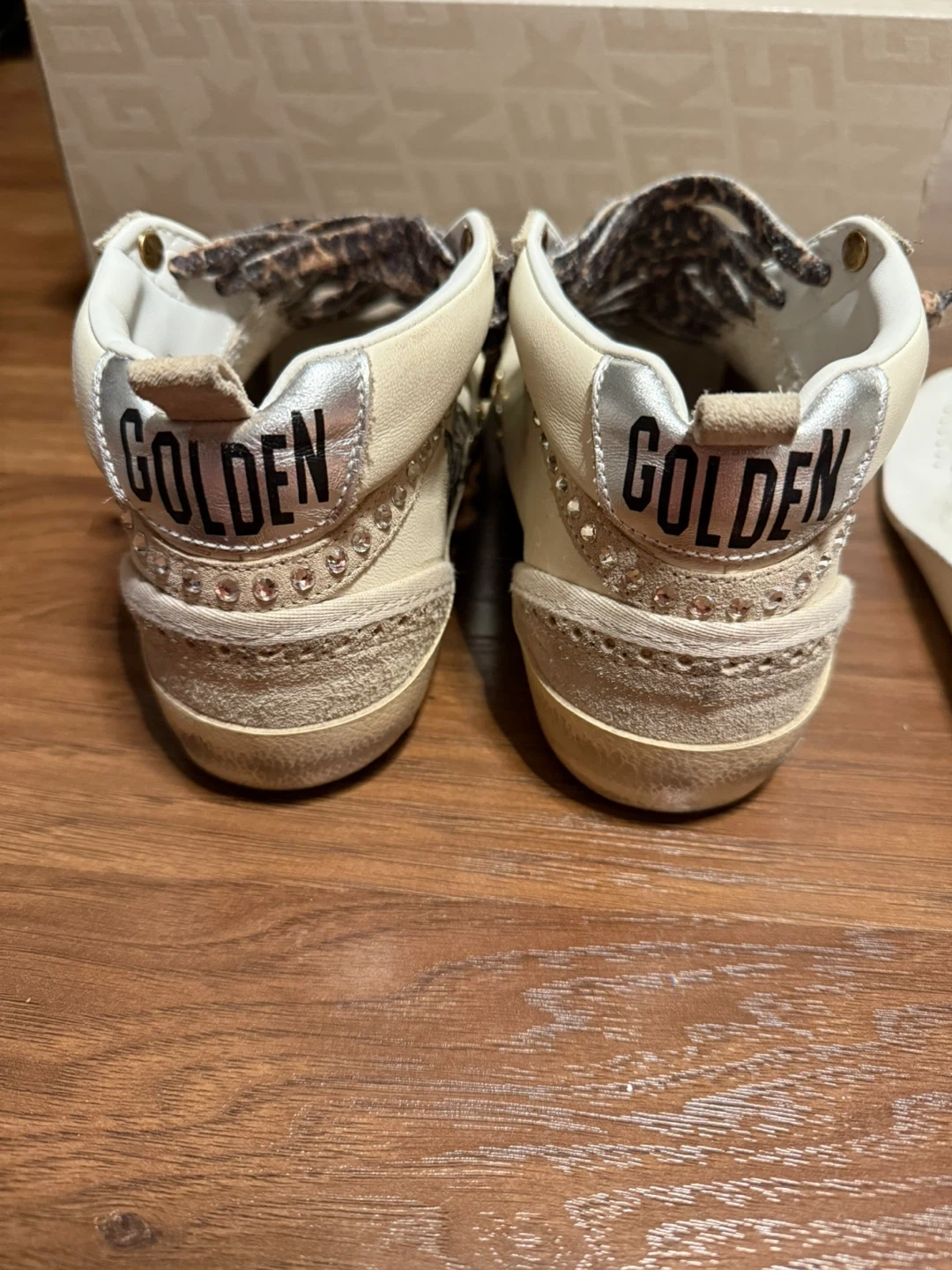 Selling a pair of Golden Goose Mid Star sneakers in size 36. They have a unique design with leopard print laces and rhinestone detailing. These sneakers are super stylish and add a touch of sparkle to any outfit! They show some signs of wear.